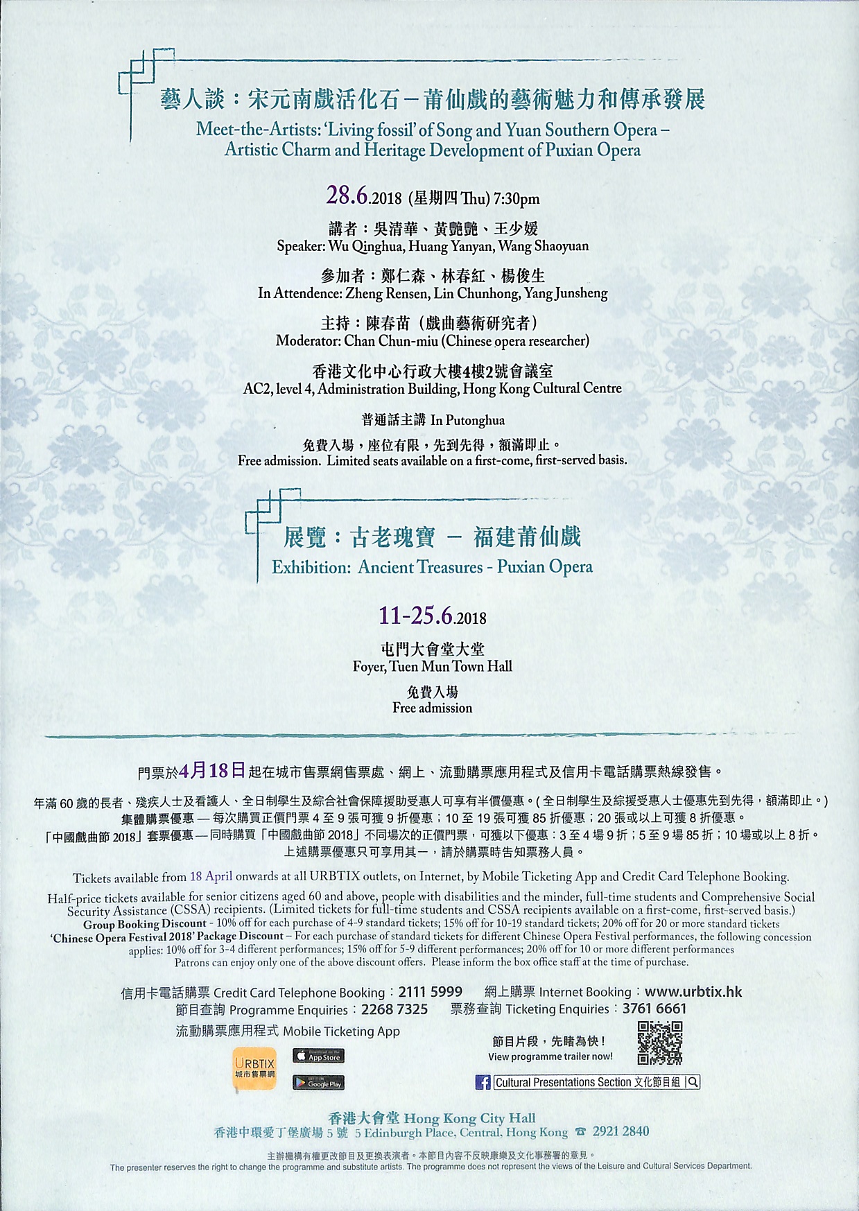 莆仙戲原稱「興化戲」,發源於莆田、仙游地區,與梨園戲、福州戲(閩劇)、高甲戲及薌劇(歌仔戲)並列福建五大劇種。莆仙戲歷史悠久,傳統劇目有五千多個,當中保留宋元南戲原貌亦有八十多個,故被稱為宋元南戲活化石,二○○六年被列入首批國家級非物質文化遺產名錄。