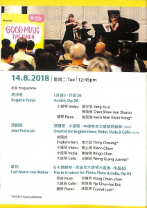 香港小交響樂團於香港大會堂定期舉行的午間音樂會,以音樂洗滌心靈,讓大家在忙碌的一天中,趁著午餐時間輕鬆一下,一邊享用午餐,一邊欣賞美妙的室樂演奏。法耶諾 古風格嬉遊曲馬天奈 三首小提琴及中提琴牧歌,H313貝多芬 C小調鋼琴三重奏,作品1之3
