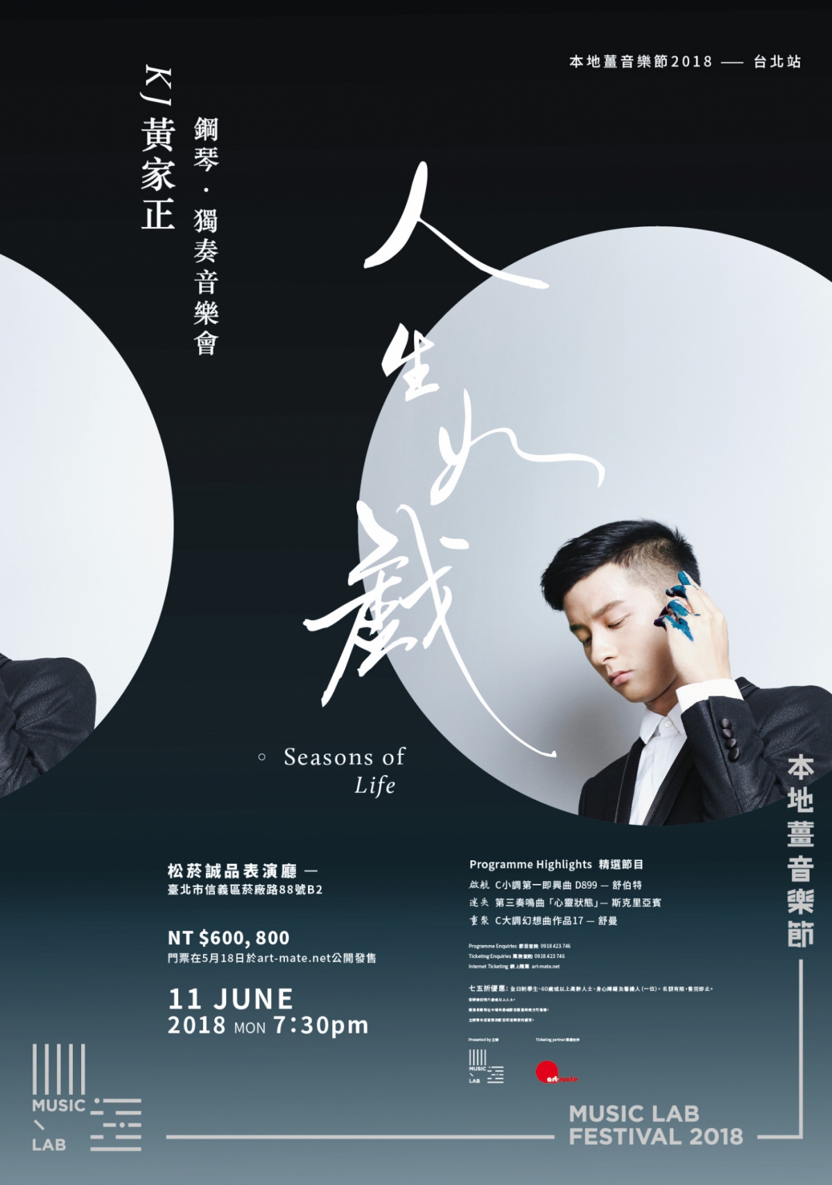 黃家正因金馬獎得獎紀錄片《音樂人生》而在香港音樂圈中變得家傳戶曉。他將以啟航、迷失及重聚為題,演出舒伯特、斯克里亞賓及舒曼五首作品,以音樂讓聽眾感受變幻莫測的人生,和他於戲後數年作為藝術家的沉澱和成長。精選節目啟航 C小調第一即興曲D899-舒伯特迷失 第三奏鳴曲「心靈狀態」-斯克里亞賓重聚 C大調幻想曲作品17-舒曼
