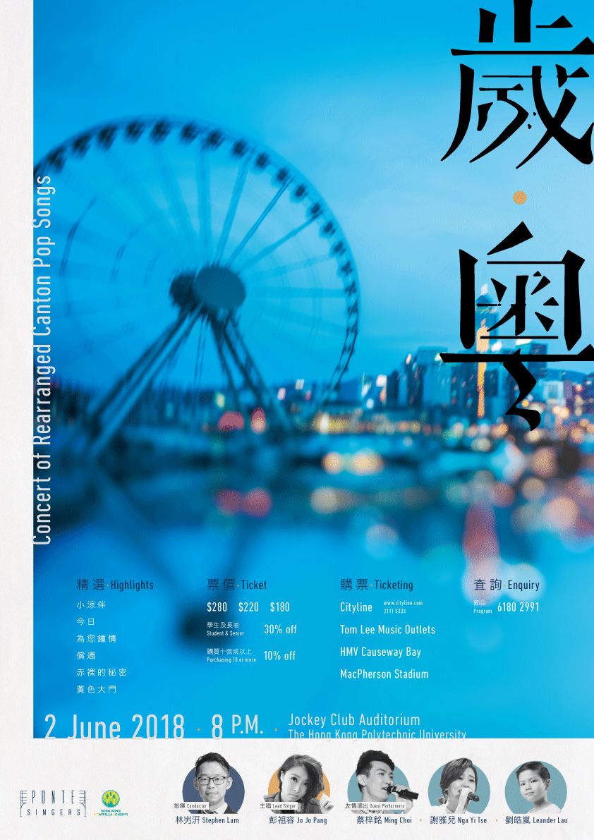 數十年來的歲月,為您帶來過幾多首廣東好歌?今年Ponte Singers聯同香港阿卡貝拉學院、Ponte Jazz Band 、4位本地編曲家及4位本地實力新晉歌手,以合唱、爵士樂及無伴奏合唱等不同音樂元素,改編多首膾炙人口的廣東流行曲,希望為觀眾重現一個只屬於廣東歌的美好「歲.粵」。