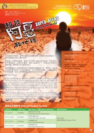 地球氣溫忽然急升,世界各地都出現嚴重乾涸,北極的冰塊急劇溶化……地球距離毀滅只剩一個月時間。眾超能人召開緊急會議,發現只有阿憂可以解決地球危機。但阿憂與人合作處處碰釘,以致陷於憂鬱,超能力也施展不了。眾超能人想盡辦法幫助阿憂,最終能否成功拯救地球?德思戲劇教育工作室聯同法國平民劇團的創團成員大衛.賓斯文一起創作《超能阿憂救地球》面具形體劇場,以色彩繽紛的造型、有趣面具配合惹笑的形體,講述一個有關超能阿憂拯救地球的故事!