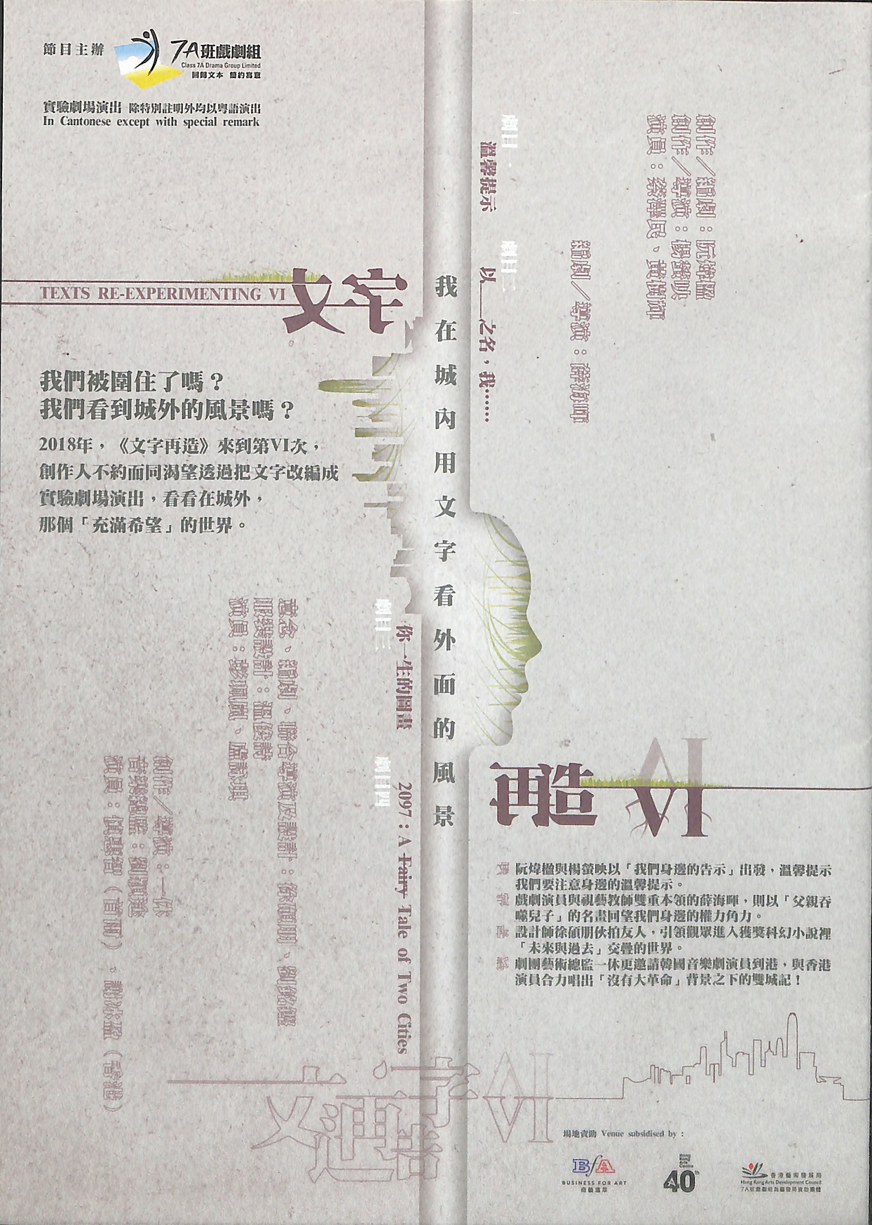 我們被圍住了嗎?我們看到城外的風景嗎?2018年,創作人不約而同渴望透過把文字改編成實驗劇場演出,看看在城外,那個「充滿希望」的世界。《文字再造VI》--我在城內用文字看外面的風景劇目一:《溫馨提示》劇目二:《以___之名,我……》劇目三:《你一生的圖畫》劇目四:《2097 : A F̶a̶i̶r̶y̶ Tale of Two Cities》