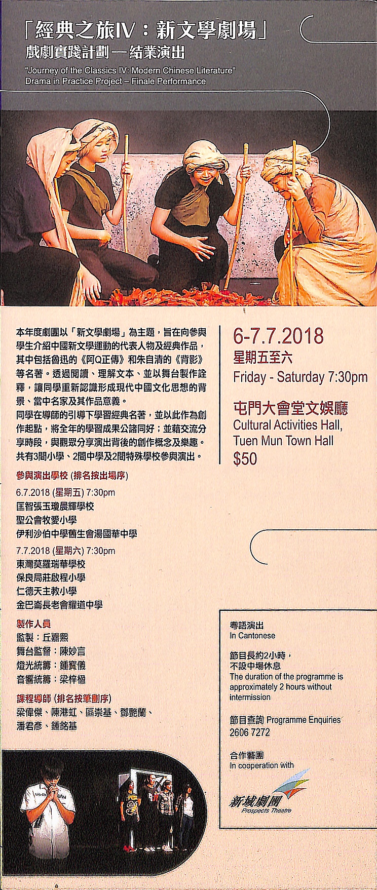 本年度劇團將戲劇計劃定名為「新文學劇場」旨在向參與學生介紹中國新文學運動的代表人物及經典作品,其中包括田漢的《關漢卿》、魯迅的《阿Q正傳》和朱自清的《背影》等名著。透過閱讀、理解文本、並以舞台製作詮釋,讓同學重新認識形成現代中國文化思想的背景、當中名家及其作品意義。