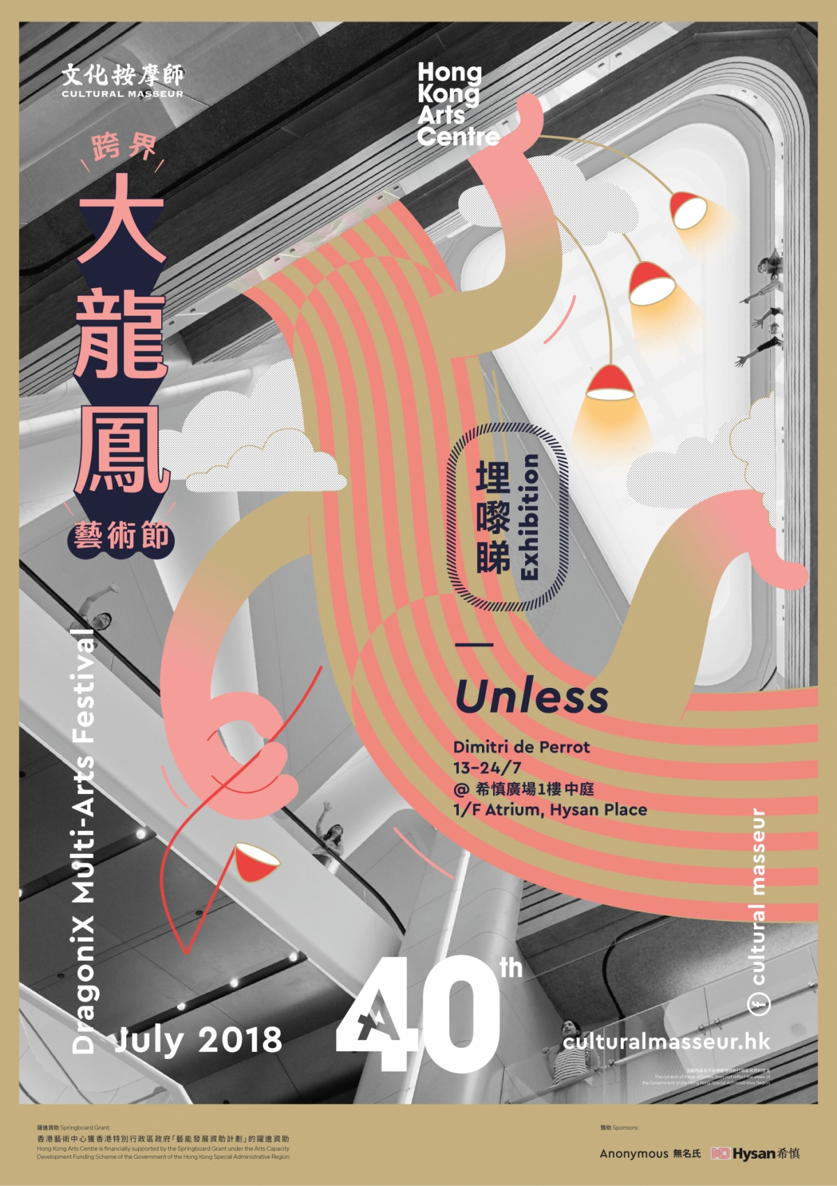 【關於藝術裝置《UNLESS》】由瑞士藝術家、音樂家及導演Dimitri de Perrot創作的藝術裝置《UNLESS》是文化按摩師「跨界大龍鳳」藝術節的亮點之一。首次於亞洲公開展出的藝術裝置位處於熱鬧的銅鑼灣市中心地段,觀衆可隨意行走、坐下或躺於其中,穿梭於揚聲器下,讓聲音帶領旅程,從中體驗生活中被遺忘的片刻。不同場景的音效配樂,與周遭環境融和撞碰,構成一道道聲音風景,有如在喧鬧裡尋獲一片悠然自得的淨土,感受微妙但感動的時刻,捕捉生活中的玩味。