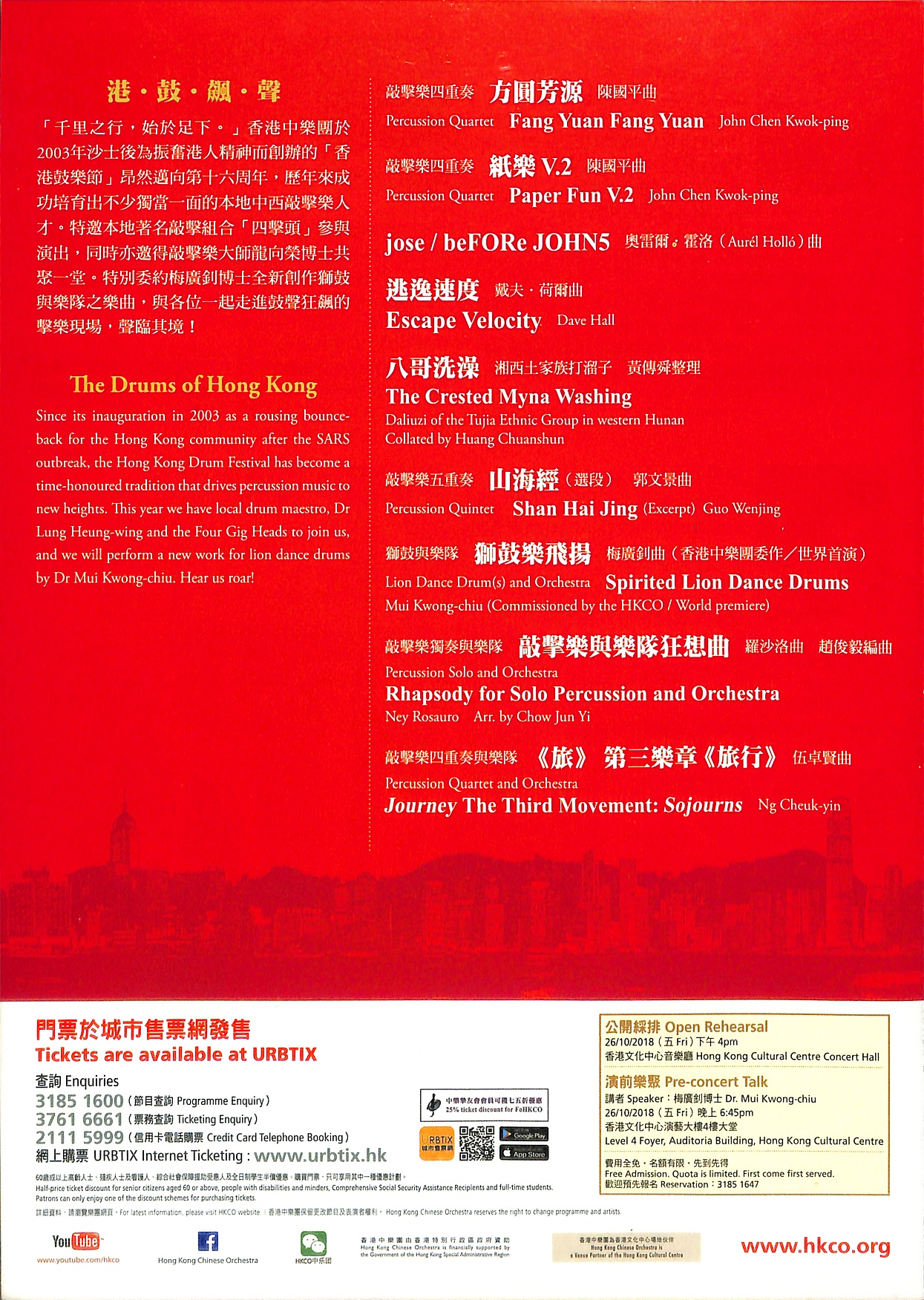 「千里之行,始於足下。」香港中樂團於 2003 年沙士後為振奮港人精神而創辦的「香港鼓樂節」昂然邁向第十六周年,歷年來成功培育出不少獨當一面的本地中西敲擊樂人才。特邀本地著名敲擊組合「四擊頭」參與演出,同時亦邀得敲擊樂大師龍向榮博士共聚一堂。特別委約梅廣釗博士全新創作獅鼓與樂隊之樂曲,與各位一起走進鼓聲狂飆的擊樂現場,聲臨其境!