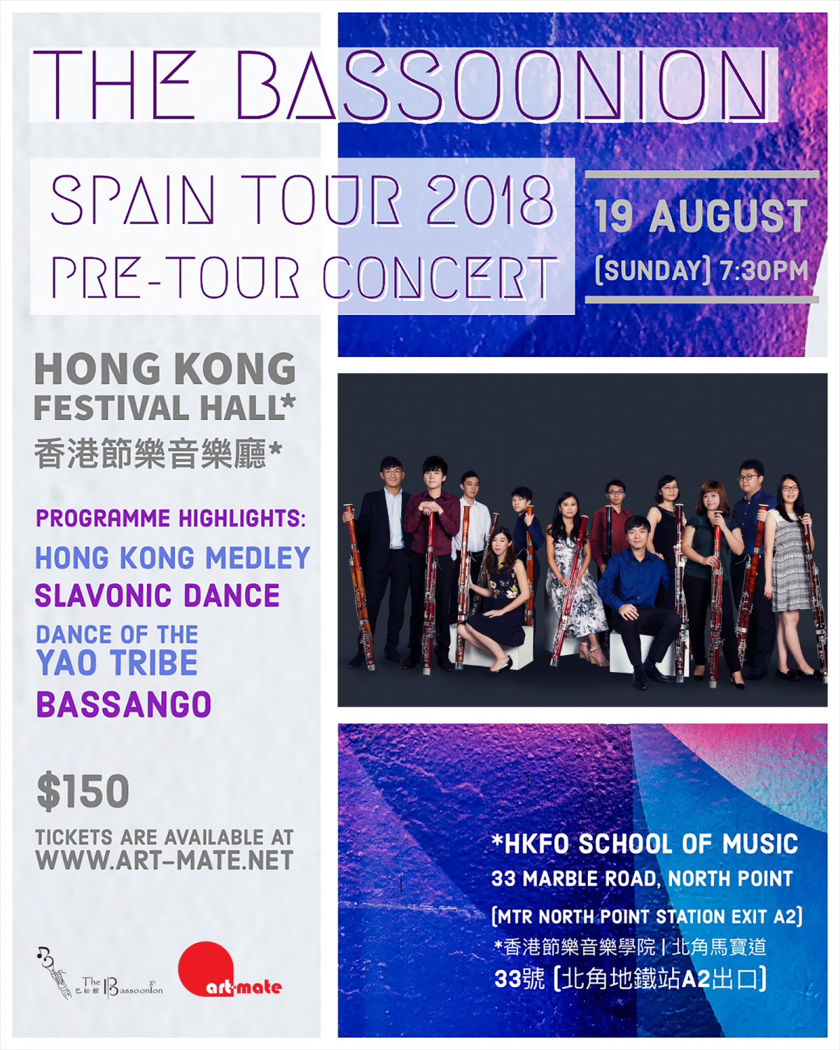 巴松館很榮幸受國際雙簧協會邀請,將於今年八月於西班牙格拉納達年會演出。是次預演音樂會除了有於西班牙演出的曲目外,我們還會演出一系列室內樂作品及改編作品,其中包括大家不能錯過的曲目- 香港Medley。此曲由巴松館委員吳家明改編,為大家帶來耳熟能詳的香港音樂,相信必定能喚起香港聽眾的回憶及共鳴。