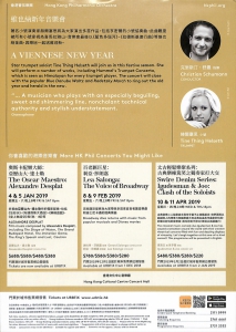 小約翰•史特勞斯《吉卜賽男爵》:序曲 小約翰•史特勞斯常動曲 格魯伯《Charivari》 亨密爾小號協奏曲 小約翰•史特勞斯《維也納氣質》及更多著名小號演奏家赫爾塞思將為大家演出多首作品,包括亨密爾的小號協奏曲,此曲難度被所有小號家視為喜馬拉雅山。音樂會最後以《藍色多瑙河》、《拉德斯基進行曲》等維也納金曲,與樂迷一起送舊迎新。