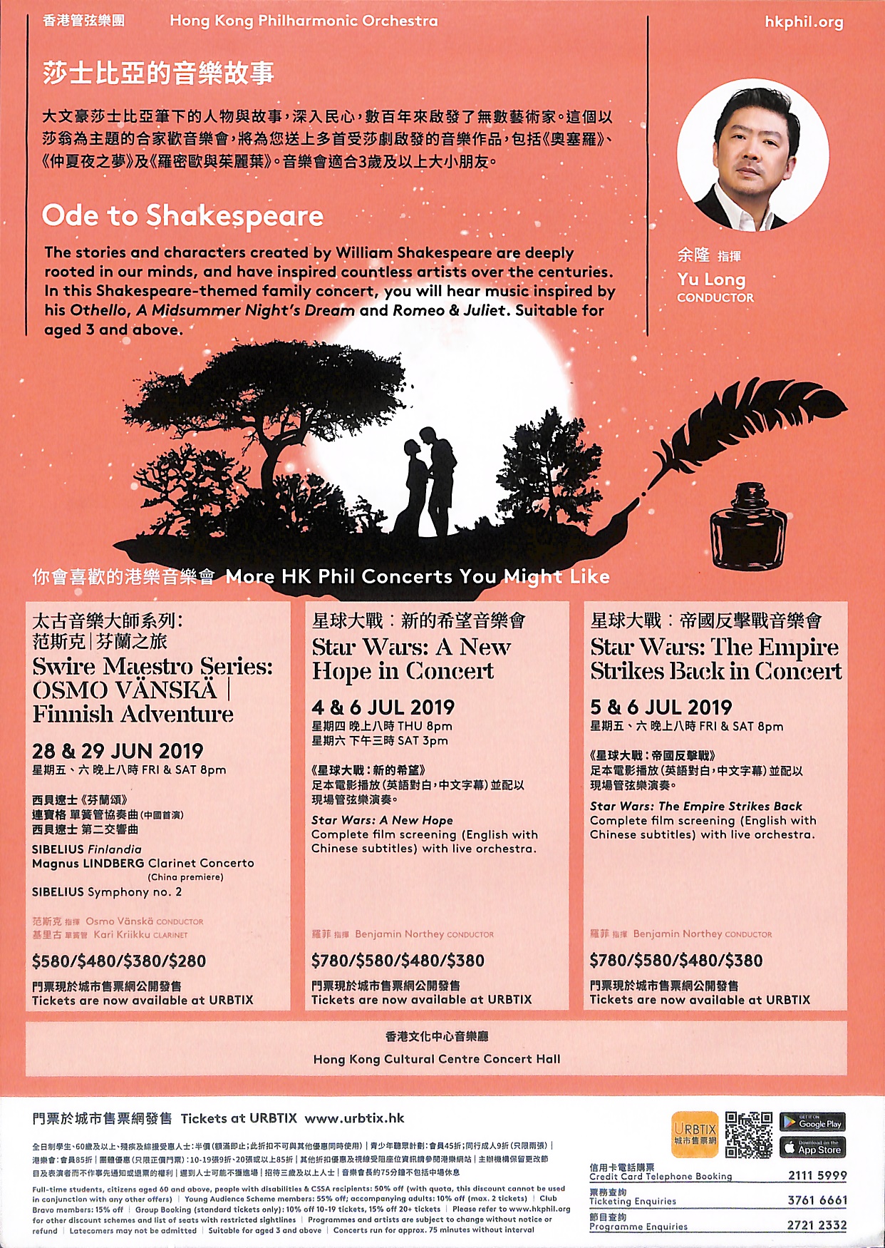 柴可夫斯基《羅密歐與茱麗葉幻想序曲》 德伏扎克《奧塞羅》序曲及更多大文豪莎士比亞筆下的人物與故事,深入民心,數百年來啟發了無數藝術家。這個以莎翁為主題的合家歡音樂會,將為您送上多首受莎劇啟發的音樂作品,包括《羅密歐與茱麗葉》、 《奧塞羅》等。音樂會適合3歲及以上大小朋友。