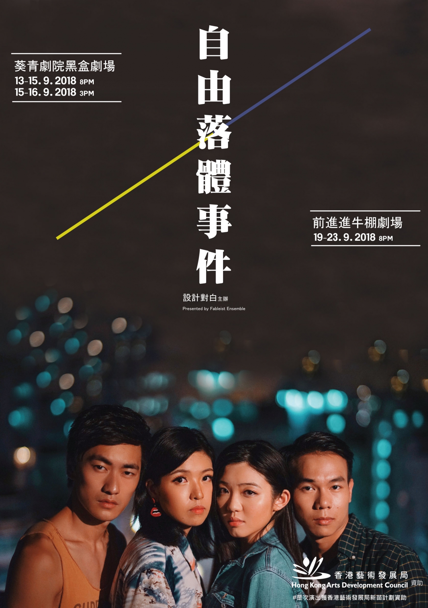 **由於八號熱帶氣旋警告信號懸掛關係,原定於2018年 9月16日(星期日)在葵青劇院黑盒劇場舉行的《自由落體事件》下午3時場次已經取消。