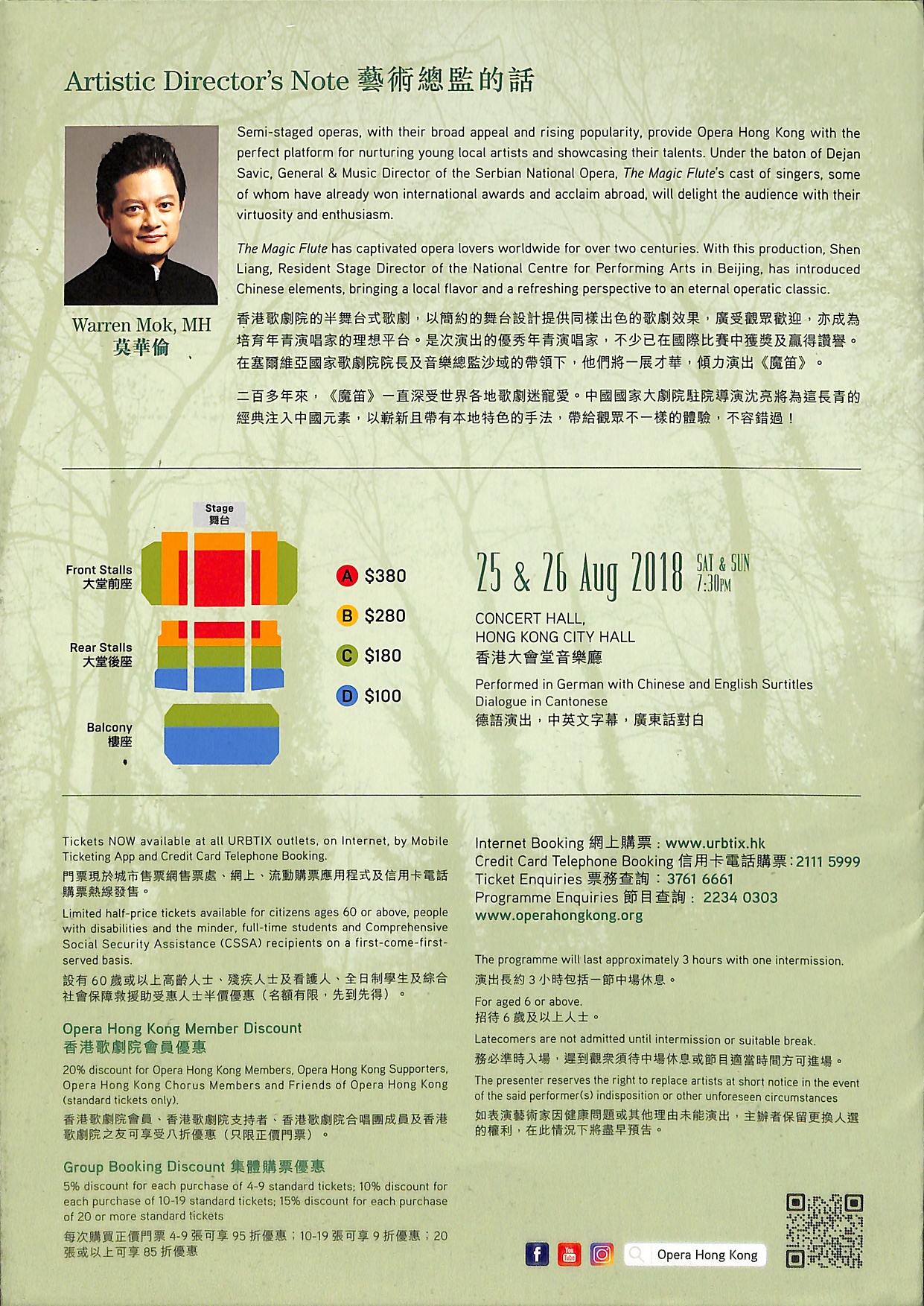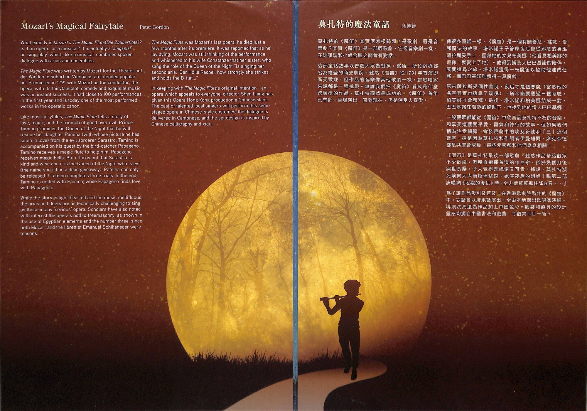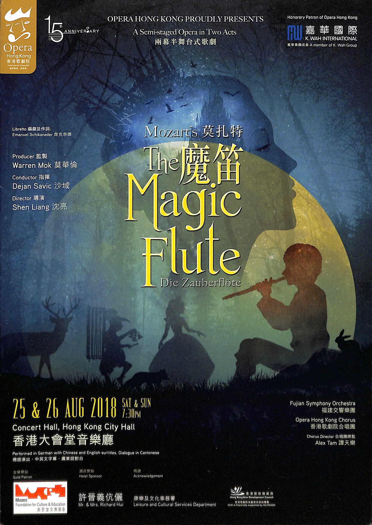 享負盛名的《魔笛》於一直深深吸引世界各地觀衆逾兩個世紀。當中包括塔米諾皇子與柏美娜公主的童話式愛情故事,祭司薩拉斯妥莊嚴的音樂,以及夜后的精彩花腔詠嘆調,實為觀衆帶來奇妙的視聽享受。兩幕歌劇德語演唱,中英文字幕