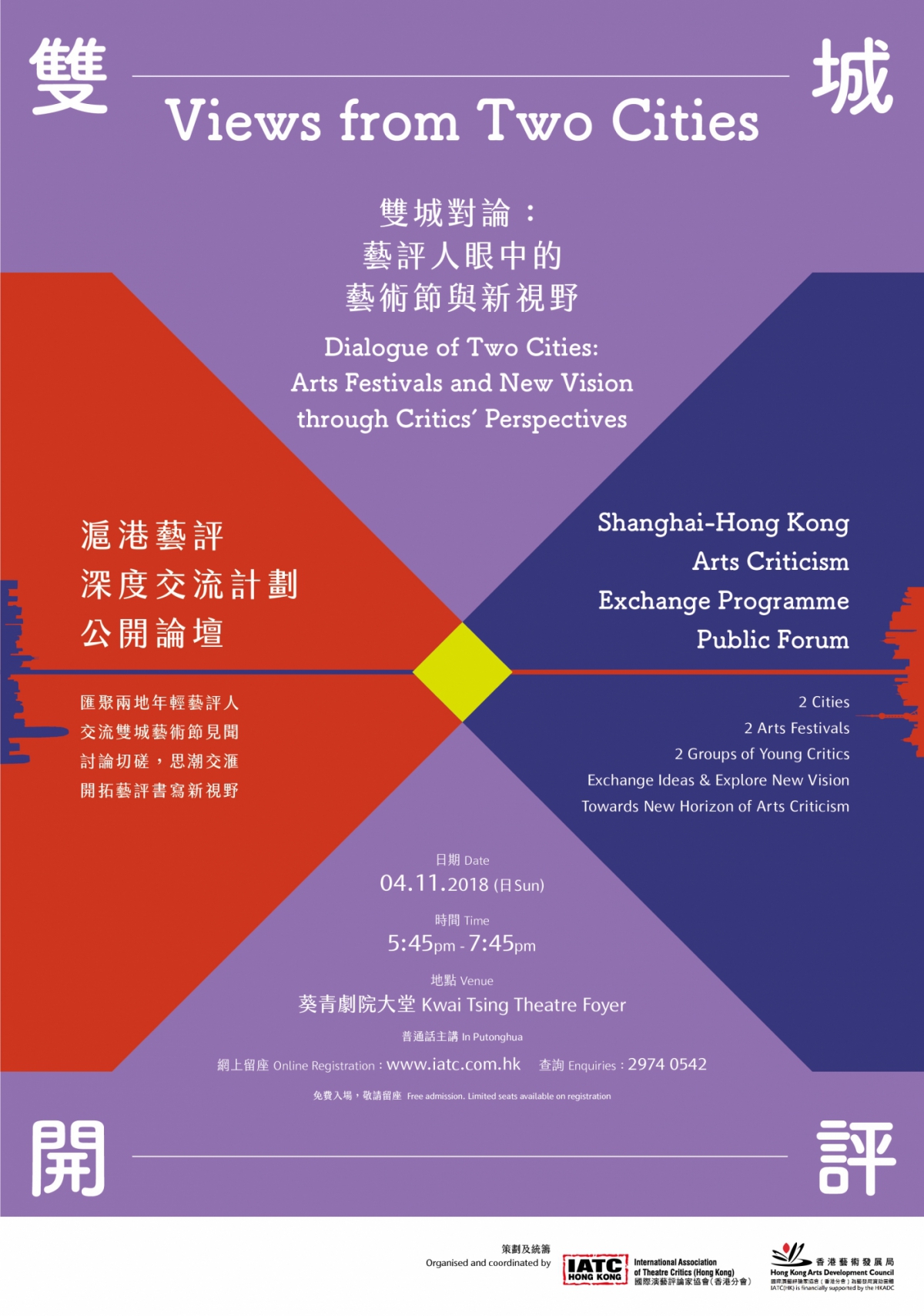 因應場地安排,活動時間由原定5:45pm-7:45pm順延至6:30pm-8:30pm,而地點則由葵青劇院大堂更改為葵青劇院演講室,敬請留意。雙城對論:藝評人眼中的藝術節與新視野匯聚兩地年輕藝評人交流雙城藝術節見聞討論切磋,思潮交匯開拓藝評書寫新視野
