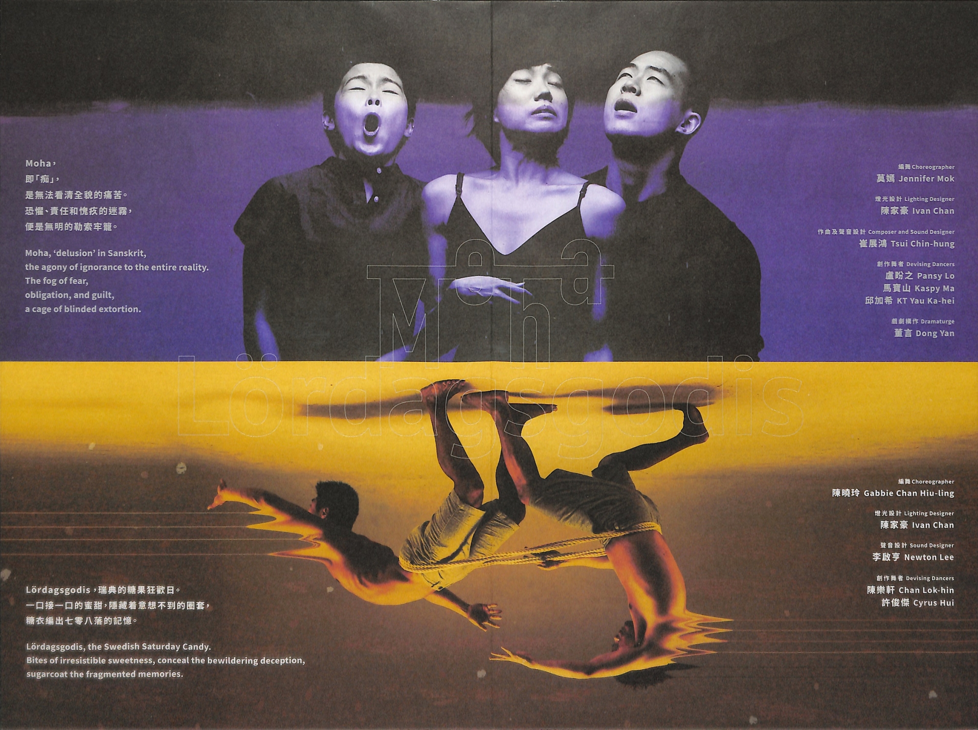 【節目】《Lördagsgodis》編舞: 陳曉玲舞者: 陳樂軒, 許俊傑 Lördagsgodis,瑞典的糖果狂歡日。一口接一口的蜜甜,隱藏著意想不到的圈套,糖衣編出七零八落的記憶。《Moha》編舞: 莫嫣舞者: 盧盼之, 馬寶山, 邱加希 Moha,即「痴」,是無法看清全貌的痛苦。恐懼、責任和愧疚的迷霧,便是無明的勒索牢籠。