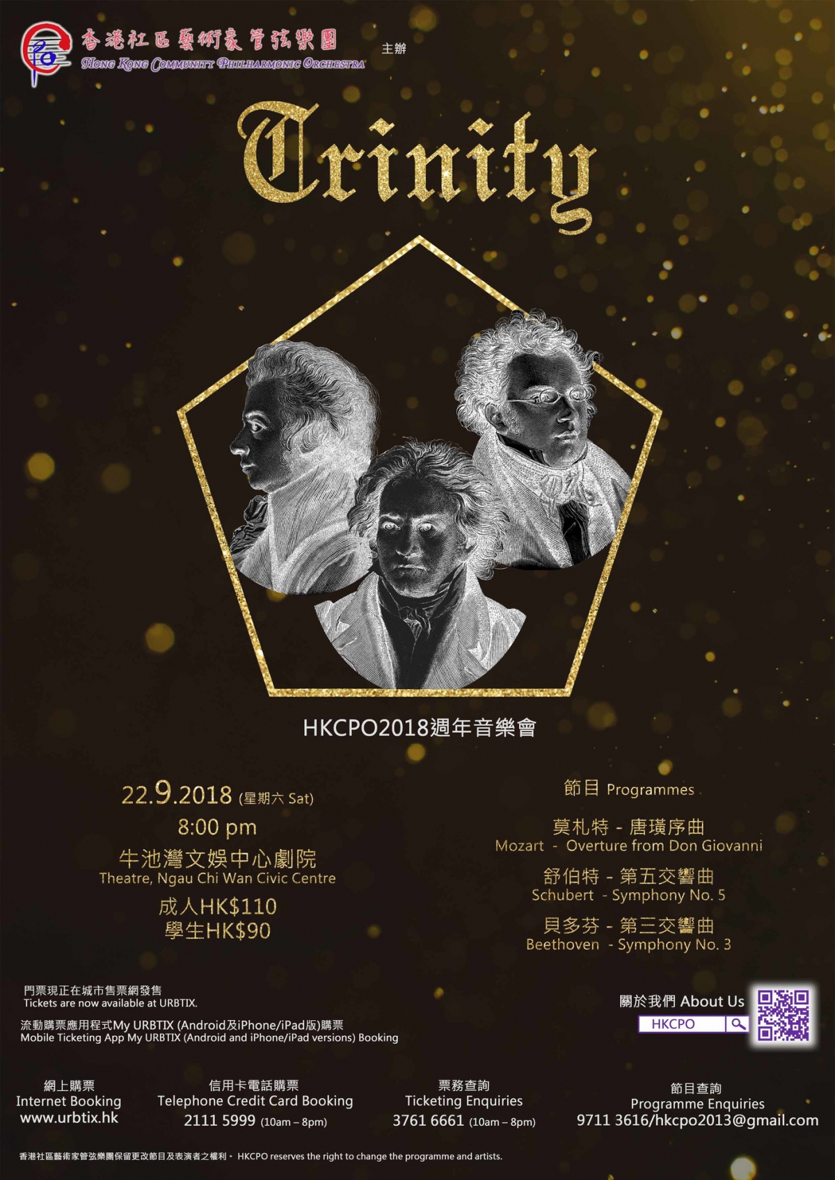 音樂是世界的通用語,透過音樂,不同文化,不同背景,不同年齡的人可以互相交流,了解,分享。其實,音樂還可以穿越時空,與上千上百年前的古人進行深情對話,學習。HKCPO 成立了五週年,亦希望可以與觀眾一起與後古典時期金三角對話:莫扎特,貝多芬和舒伯特。他們三人不但是著名的音樂家,而且更是「三師徒」;貝多芬一直十分崇拜莫扎特,並曾到訪跟隨他學習;舒伯特對在他面前的兩位大師亦十分推崇,雖然未能親身跟貝莫二人學習,但在曲風中卻傳承了兩位,成為了浪漫主義的基石。