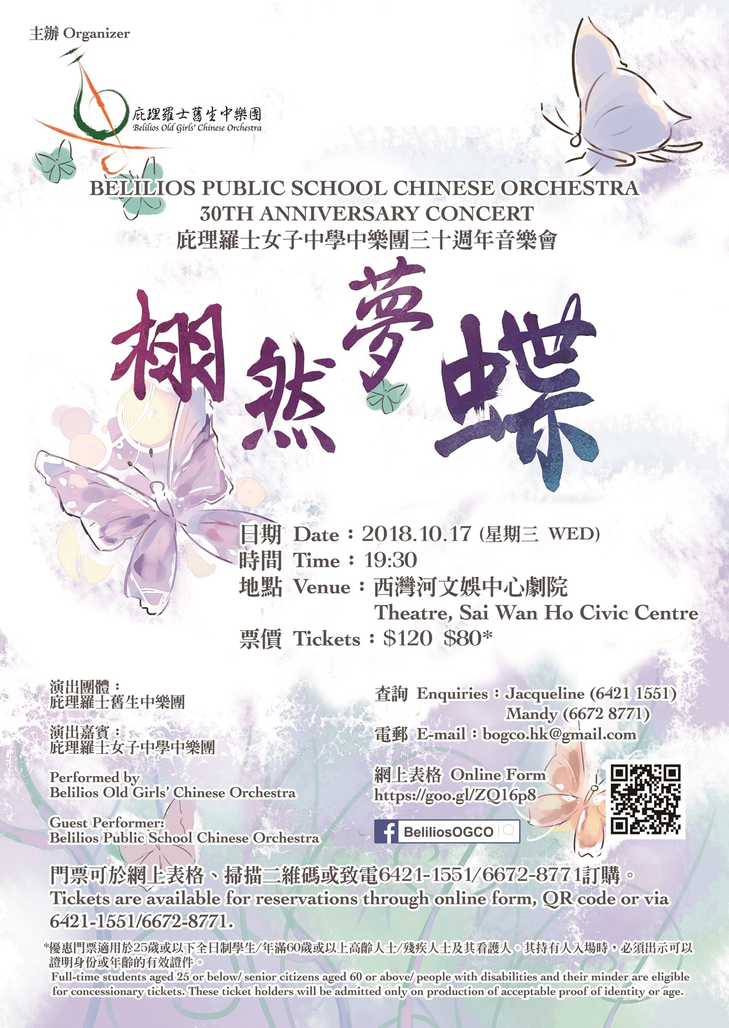 今年是庇理羅士女子中學中樂團成立30週年,今次音樂會將由幾代不同的庇理羅士中樂團團員一同演出,為大家帶來似夢如真的一晚。演出曲目包括《南疆舞曲》、《戰馬奔騰》、《夏之夜》、《夢蝶》等等...售票途徑:1. 透過 https://goo.gl/ZQ16p8 訂票,將會有專人回覆付款手續2. 電話訂票:Jacqueline (6421 1551) / Mandy (66728771)