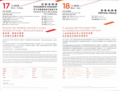 2018年全新製作的兒童音樂會,請來多才多藝的演員陳明恩飾演馬可孛羅,與來自德國、意大利、台灣及香港的演員透過意大利即興喜劇把嘉年華搬上舞台,加上六位傑出的中、西樂演奏家及年輕舞者,以戲劇、音樂及舞蹈的巧妙配搭,帶領觀眾探究面譜背後的傳統,以新角度體驗嘉年華文化。