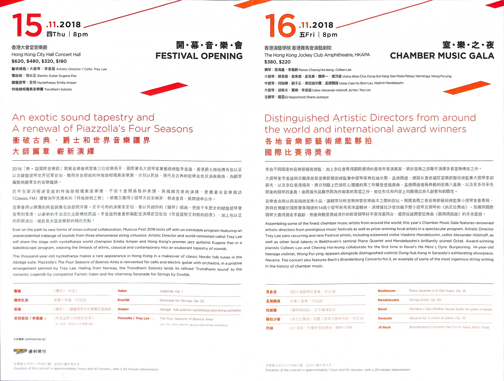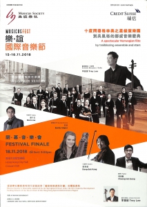 特倫赫姆獨奏家樂團將會以其純淨凝煉的音色,地道演繹挪威國寶作曲家葛利格的《兩首旋律》及《霍爾堡組曲》。多年來與樂團合作無間的鍵盤提琴家安珀則會聯同藝術總監李垂誼,破天荒同台演出前者為是次盛會新編的作品。國際知名的小提琴家姜東錫,將與香港音樂家兼新任上海交響樂團中提琴首席劉子正,攜手演出莫札特流麗典雅的《交響協奏曲》。此外,新晉鋼琴演奏家張海量將會獻上聖桑名為《結婚蛋糕》的圓舞隨想曲,作為挪威國王伉儷2018年金婚紀念的賀禮,為音樂節畫下璀璨句點。