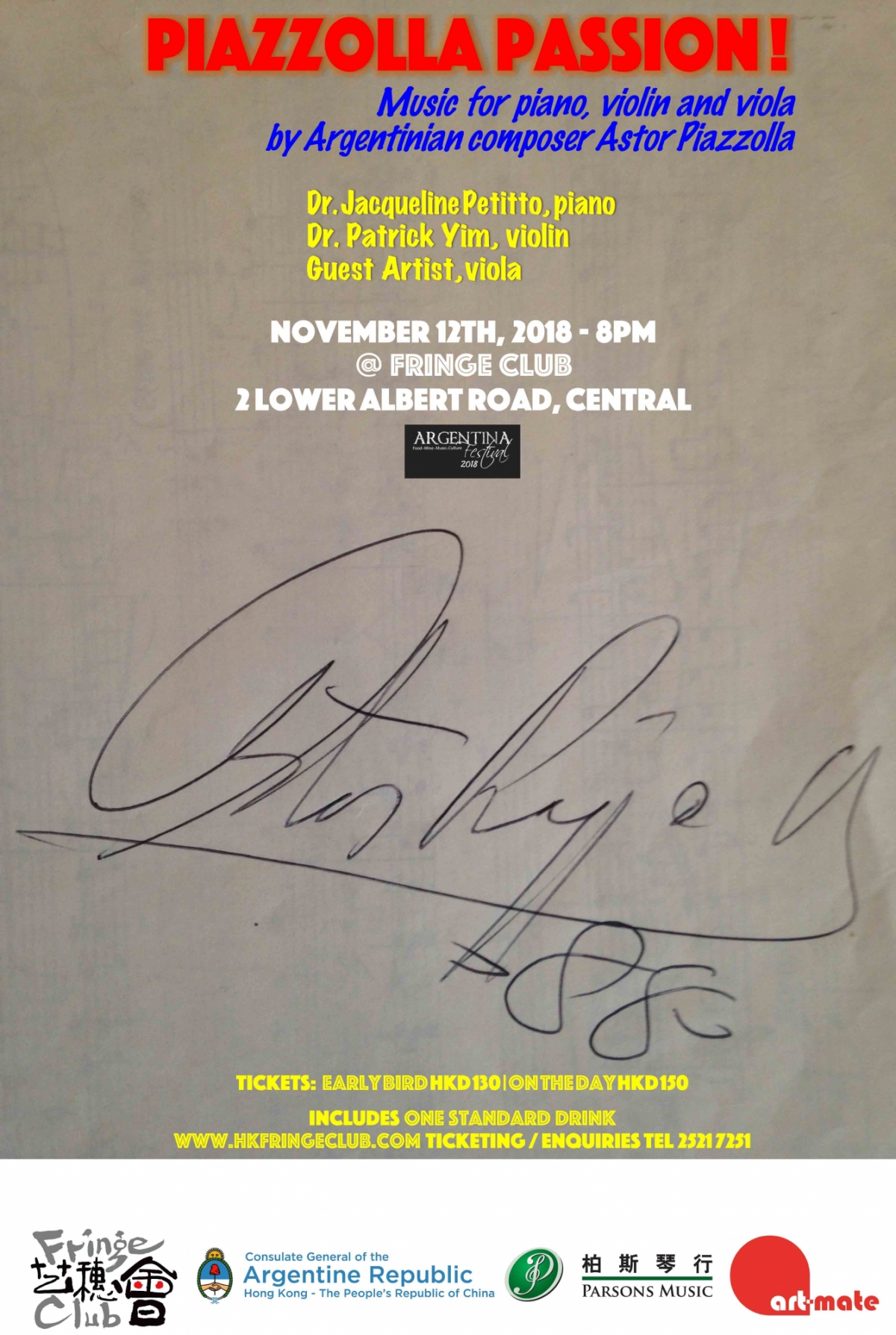 由阿根廷作曲家Astor Piazzolla呈獻 - 一場鋼琴、小提琴和中提琴的室樂演奏會。