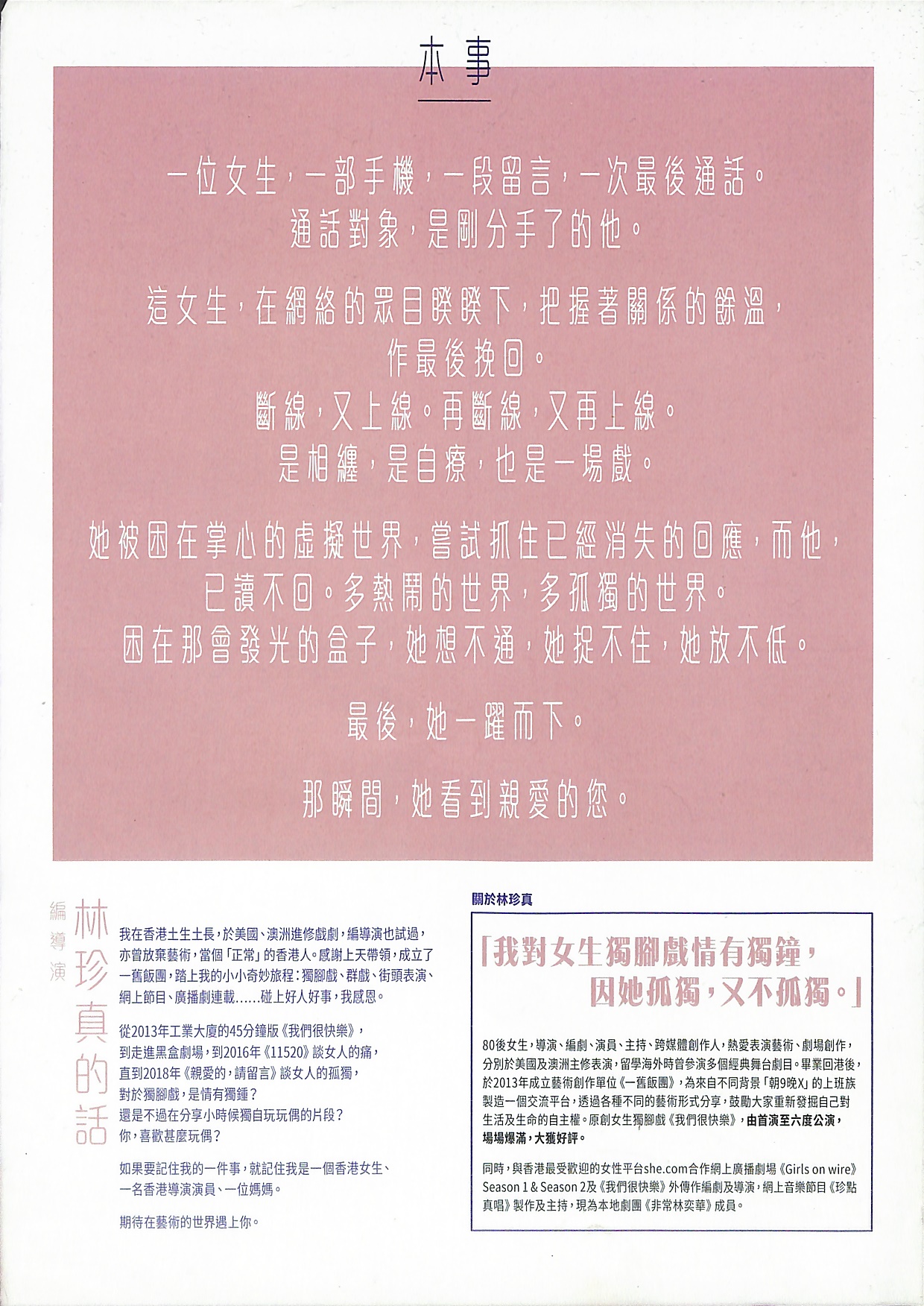 一位女生,一部手機,一段留言,一次最後通話。通話對象,是剛分手了的他。這女生,在網絡的眾目睽睽下,把握著關係的餘溫,作最後挽回。斷線,又上線。再斷線,又再上線。是相纏,是自療,也是一場戲。