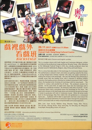 春暉粤藝工作坊創作的舞台劇《戲裡戲外看戲班》(BACKSTAGE),乃一齣新穎獨特的粤劇導賞節目,由專業舞台演員曾慕雪編寫及執導。2014年與2015年此劇曾於歐洲多個國家上演,包括英國(倫敦、愛丁堡)、荷蘭(阿姆斯特丹、鹿特丹和海牙)、比利時(布魯塞爾和安特衛普)與意大利(羅馬和維泰博);及後亦於2016年北京國際青年藝術節及2017年韓國首爾表演藝術博覽會演出。