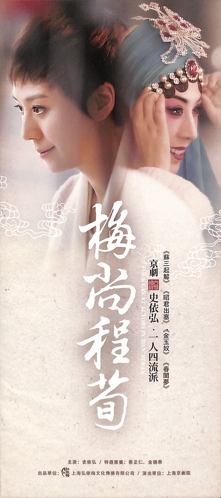 史依弘選了梅、尚、程、荀四大流派的經典劇碼《蘇三起解》、《昭君出塞》、《春閨夢》和《金玉奴》,“四大名旦”出文入武、風姿迥異的流派特色由她一人全力展現。