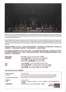 是次韓國國家芭蕾舞團準備了《斯巴達卡斯》的劇目,內容以真實故事羅馬帝國為背景,講述在戰爭中被俘的角色淪為奴隸後所展開的革命故事,有著不少衝突和激烈的舞蹈場面。這同時也是俄羅斯著名舞團總監五十年前創作的作品,可說是經典重現。