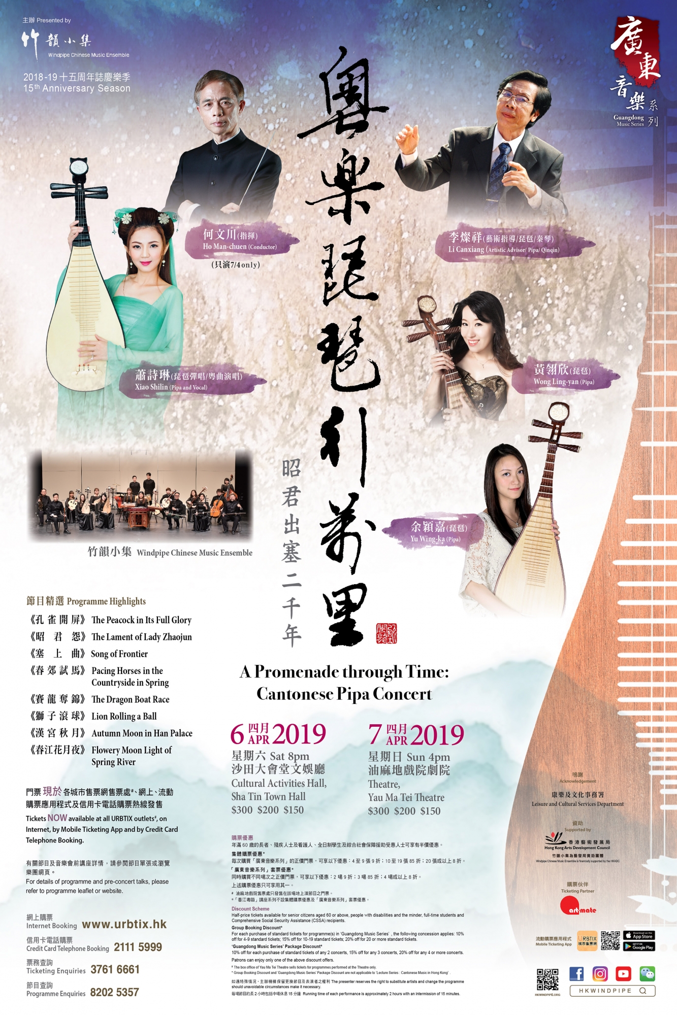 中國琵琶藝術經歷上千年的發揚,超越了一般的民族音樂形態,成為漢文化之精粹。「昭君出塞」的故事,千百年來家喻戶曉,王昭君也成為琵琶的「代言人」。音樂會特邀粵樂琵琶藝術代表人物李燦祥作藝術指導及客席演奏,展示「昭君出塞」二千年後,琵琶傳到南粵的發展,以歷代粵樂琵琶名家及北曲粵化之作品,印證粵人不拘一格、不從一說、不守一隅的獨立自信及開拓創造之文化性格和藝術精神。節目: 昭君怨、塞上曲、賽龍奪錦、春江花月夜……