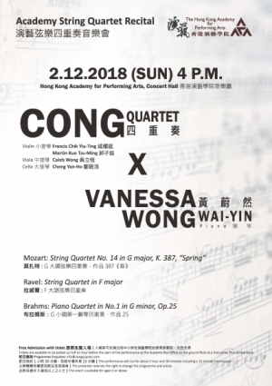 Cong 四重奏在2015年於印弟安納大學積可斯音樂學院組成,師隨太平洋四重奏和陳浩堂教授(前邁阿密四重奏第一小提琴手), 亦曾受學於鮑羅丁、卡雲妮、克里夫蘭、上海、東京四重奏等多隊著名四重奏的成員。成員在多所世界著名音樂學府如倫敦皇家音樂學院、紐約巴德學院、伊士曼音樂學院、印弟安納大學等畢業,現駐於香港演藝學院。四重奏成員曾在大阪國際音樂比賽、愛麗絲與愛倫諾·勛菲爾德弦樂比賽、新世代藝術比賽、利馬青年藝術家大賽等比賽中獲獎,並在不同音樂節和研討會中擔任多隊著名四重奏包括艾里安娜四重奏、Blair 四重奏、Dover 四重奏和魯賓斯四重奏等等的助教, 亦曾跟世界知名的演奏家同台演出, 包括應氏四重奏、小提琴巨星貝爾、俄國中提琴大師巴舒米特、前紐約愛樂團團長格蘭·迪克特羅等等。是次音樂會,Cong 四重奏除了會演出莫扎特和拉威爾兩首膾炙人口的弦樂四重奏作品外,成員亦將會夥拍香港最出色的年青鋼琴家之一黃蔚然演奏布拉姆斯g小調第一鋼琴四重奏,實在不容錯過。