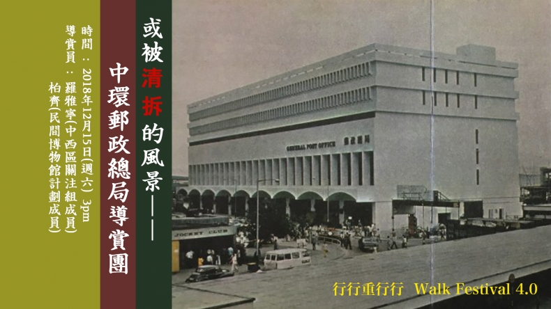 今次導賞團將帶大家回顧中環郵政總局的歷史,它的建築特色、社會及文化價值,以及保育這座地標建築的意義。由於郵政總局與鄰近的大會堂、愛丁堡廣場及停車場有群組關係,我們也會一起看看這些建築。