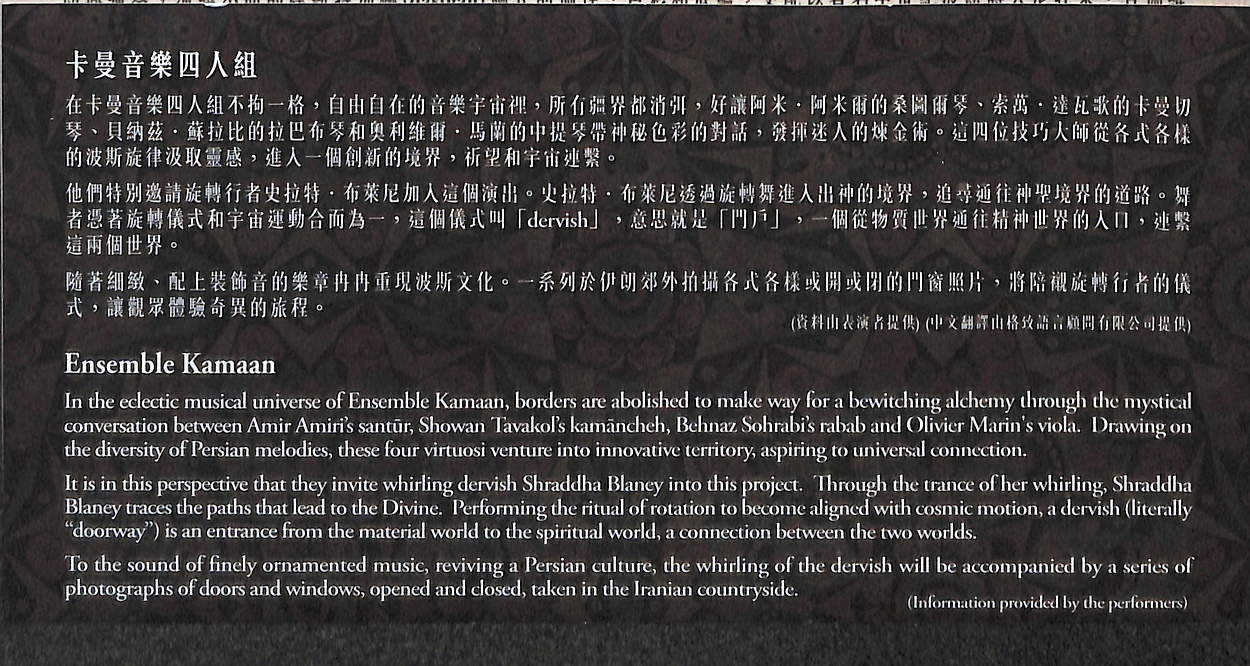 在卡曼音樂四人組不拘一格,自由自在的音樂宇宙,所有疆界都消弭,好讓阿米.阿米爾的桑圖爾琴丶索萬.達瓦歌的卡曼切琴丶貝納茲.蘇拉比的拉巴布琴和奧利維爾.馬蘭的中提琴帶神秘色彩的對話,發揮迷人的煉金術。這四位技巧大師從各式各樣的波斯旋律汲取靈感,進入一個創新的境界,祈望和宇宙連繫。