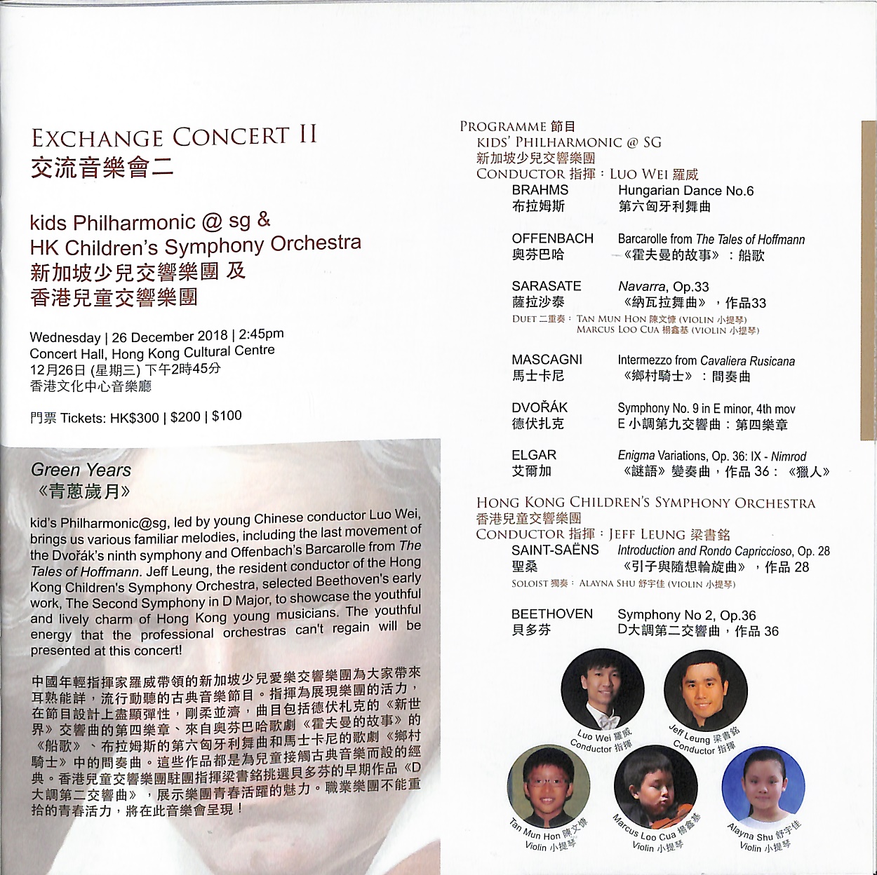 中國年輕指揮家羅威帶領的新加坡少兒愛樂交響樂團為大家帶來耳熟能詳,流行動聽的古典音樂節目。指揮為展現樂團的活力,在節目設計上盡顯彈性,剛柔並濟,曲目包括德伏札克的《新世界》交響曲的第四樂章、來自奧芬巴哈歌劇《霍夫曼的故事》的《船歌》、布拉姆斯的第六匈牙利舞曲和馬士卡尼的歌劇《鄉村騎士》中的間奏曲。這些作品都是為兒童接觸古典音樂而設的經典。香港兒童交響樂團駐團指揮梁書銘挑選貝多芬的早期作品《D大調第二交響曲》,展示樂團青春活躍的魅力。職業樂團不能重拾的青春活力,將在此音樂會呈現!