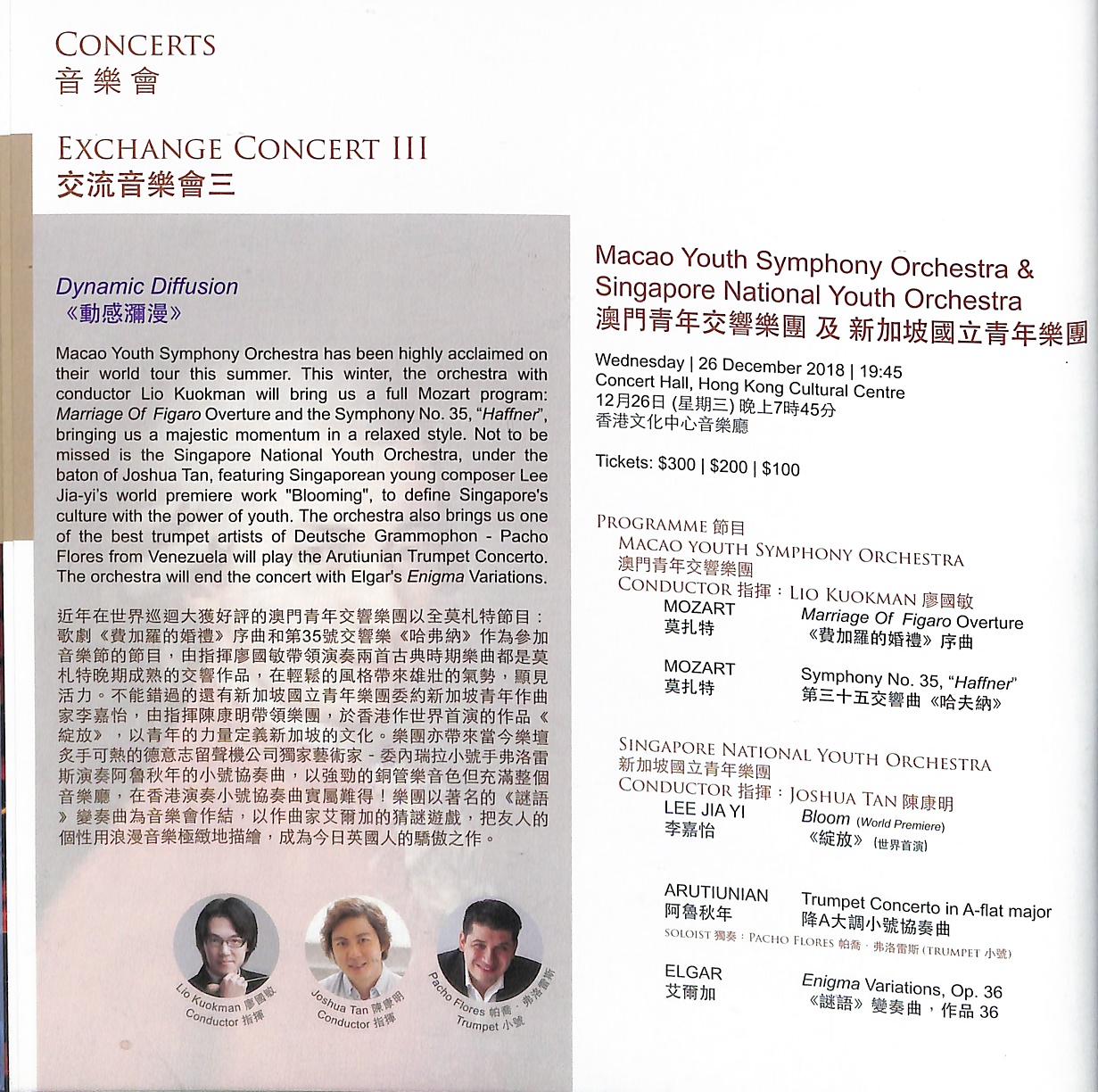 近年在世界巡迴大獲好評的澳門青年交響樂團以全莫札特節目:歌劇《費加羅的婚禮》序曲和第35號交響樂《哈弗納》作為參加音樂節的節目,由指揮廖國敏帶領演奏兩首古典時期樂曲都是莫札特晚期成熟的交響作品,在輕鬆的風格帶來雄壯的氣勢,顯見活力。不能錯過的還有新加坡國立青年樂團委約新加坡青年作曲家李嘉怡,由指揮陳康明帶領樂團,於香港作世界首演的作品《綻放》,以青年的力量定義新加坡的文化。樂團亦帶來當今樂壇炙手可熱的德意志留聲機公司獨家藝術家 - 委內瑞拉小號手弗洛雷斯演奏阿魯秋年的小號協奏曲,以強勁的銅管樂音色但充滿整個音樂廳,在香港演奏小號協奏曲實屬難得!樂團以著名的《謎語》變奏曲為音樂會作結,以作曲家艾爾加的猜謎遊戲,把友人的個性用浪漫音樂極緻地描繪,成為今日英國人的驕傲之作。