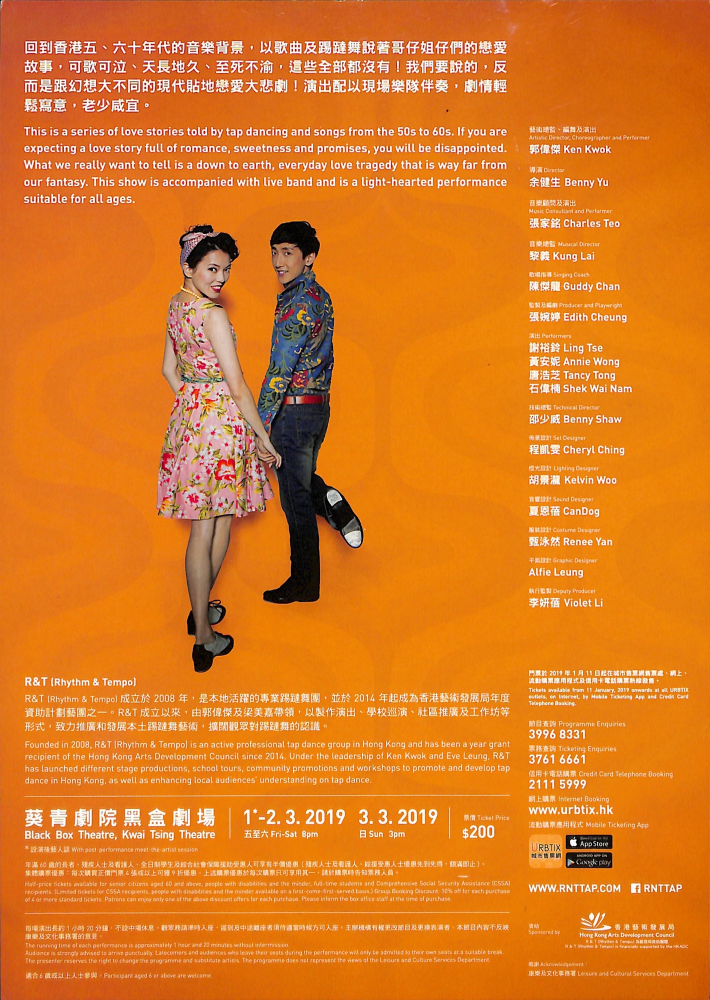 回到香港五、六十年代的音樂背景,以歌曲及踢躂舞說著哥仔姐仔們的戀愛故事,可歌可泣、天長地久、至死不渝,這些全部都沒有!我們要說的,反而是跟幻想大不同的現代貼地戀愛大悲劇!演出配以現場樂隊伴奏,劇情輕鬆寫意,老少咸宜。