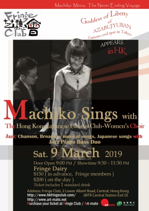 被譽為東京著名六本木區「自由女神」的日本歌手 三浦真知子 再次來到藝穗會演出!演唱精選曲目包括美國標準爵士樂曲、法國香頌、百老匯音樂劇和日本歌曲。這次音樂會邀得日本鋼琴手 田村和大 及香港低音大低琴手Steve Mui伴奏,再加上香港日本人合唱團的成員和唱,陣容頂盛!