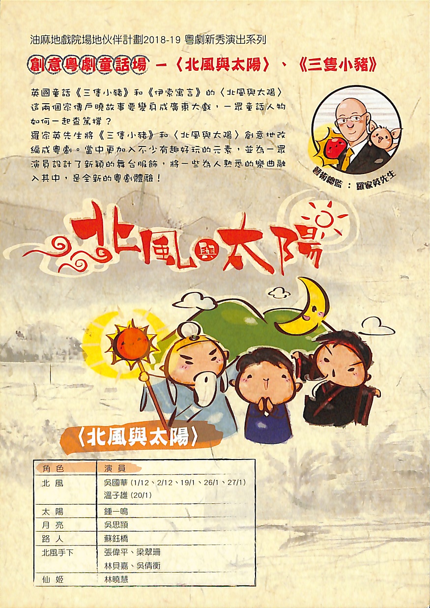 英國童話《三隻小豬》和《伊索寓言》的〈北風與太陽〉這兩個家傳戶曉故事要變身成廣東大戲,一眾童話人物如何一起查篤撐 ?羅家英先生將《三隻小豬》和〈北風與太陽〉創意地改編成粵劇。當中更加入不少有趣好玩的元素,並為一眾演員設計了新穎的舞台服飾,將一些為人熟悉的樂曲融入其中,是全新的粵劇體驗!
