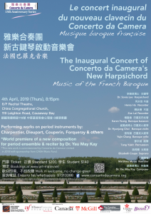 雅樂合奏團在此音樂會將聯同著名加拿大籍鍵盤家李敏琪博士呈獻一系列法國十七及十八世紀巴羅克時期俱影響力的作曲家的器樂及聲樂作品,當中包括Marc-Charpentier, Charles Dieupart, Antoine Forqueray, Michael Lambert, and François Couperin.