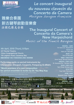 為慶祝本團15周年的成立和新古鍵琴的啟用,本團委約了香港作曲家邱美琪博士創作一首全新的室樂作品給古樂器及詩歌朗讀。另外,法國籍藝人Matthieu Motte 朗讀法國巴羅克作曲家Français Couperin 的 Apothéose de Lully, 歌頌太陽皇路易十四御用的宮廷音樂總監 Jean -Baptiste Lully. Lully 是法國巴羅音樂及藝術的始祖及大師。