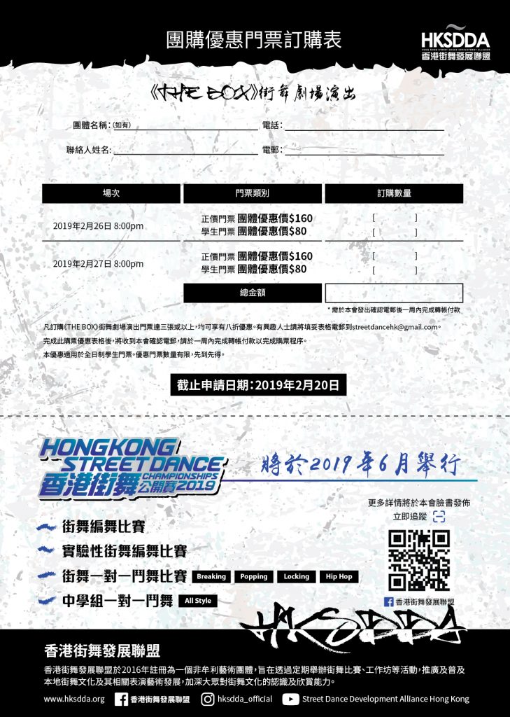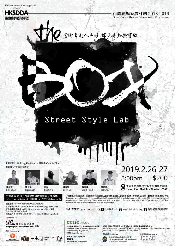「當街舞走進劇場,探索未知與可能」──《THE BOX- Street Style Lab》是由香港街舞發展總會打造的街舞劇場演出,由陳紹傑、陳伯顯、蘇樂鍵、雷超、龐俊達、陳頴業六位街舞界實驗者編出三支各具風格的作品,一同呈現舞台!