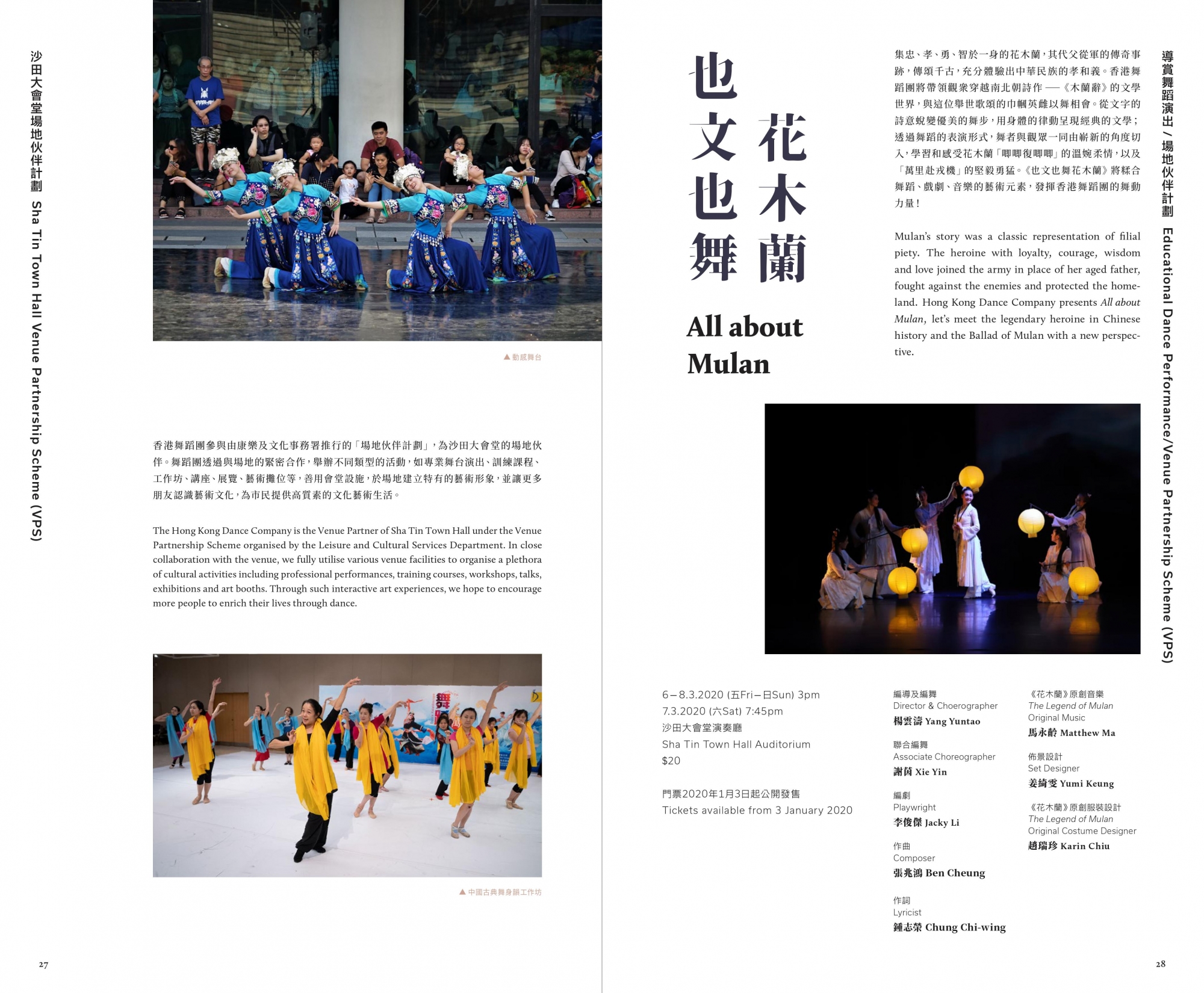集忠、孝、勇、智於一身的花木蘭,其代父從軍的傳奇事跡,傳 頌千古,充分 體 驗出中華民 族的孝 和義。香 港舞蹈團將帶領觀衆穿越南北朝詩作-《木蘭辭》的文學世界,與這位舉世歌頌的巾幗英雌以舞相會。從文字的詩意蛻變優美的舞步,用身體的律動呈現 經典的文學;透過舞蹈的表演形式,舞者與 觀 眾一同由嶄新的角度切入,學習和感受花木蘭「唧唧復唧唧」的溫婉柔情,以及「萬里赴戎機」的堅毅勇猛。《也文也舞花木蘭》將糅合舞蹈、戲 劇、音樂的藝術 元 素,發揮香 港舞蹈團的舞動力量!