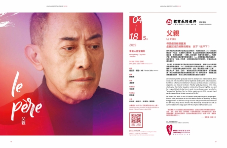 《父親》由法國最炙手可熱的青年劇作家齊勒編寫,榮獲2014 法國莫里哀戲劇獎最佳劇本,2017 年香港首演十四場全部爆滿,一票難求,並榮獲第二十七屆香港舞台劇獎四大獎項,包括:最佳導演(悲劇 / 正劇)、最佳男主角(悲劇 / 正劇)、最佳燈光設計及年度優秀製作。是次載譽重演,再次特邀前藝術總監毛俊輝飾演父親一角,聯同彭杏英、劉雅麗及話劇團重量級演員,原班人馬再次演繹這個充滿張力的劇作。