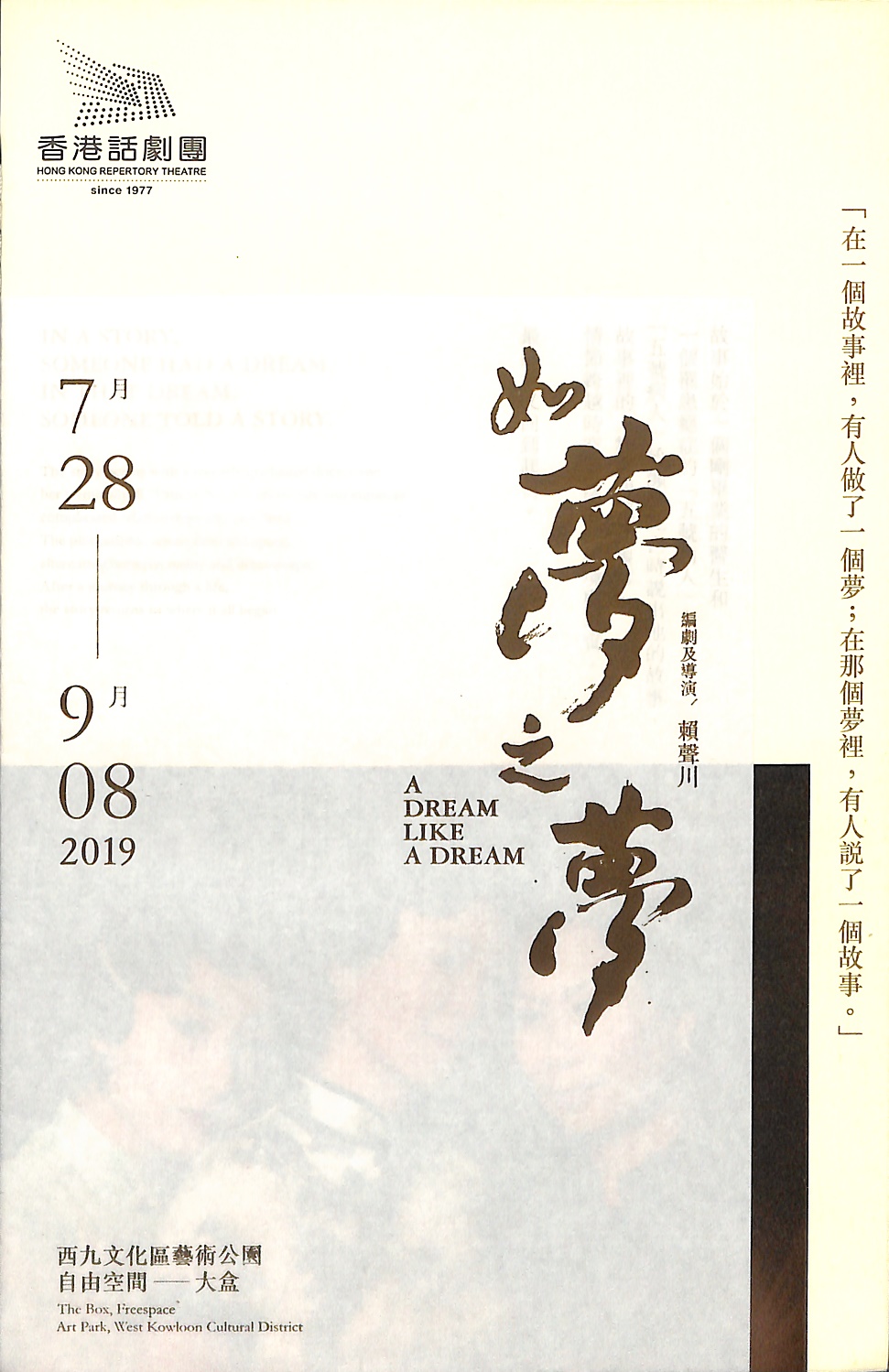 《如夢之夢》是廿一世紀華人劇場最受矚目的話劇之一,由被《亞洲週刊》譽為「亞洲劇場導演之翹楚」的賴聲川編導,其舞台和觀眾席設計獨特,演出長約八小時,給予觀眾突破的觀劇體驗,同時引起劇壇極大迴響。觀眾可坐在可360°旋轉的座椅,隨意調較角度觀看環迴的舞台演出。置身其中,彷彿忘記時間的流逝,遊走於故事與夢境之間。話劇團曾於2002年將此劇帶到香港,門票迅即售罄。時至今日,《如夢之夢》已於北京、上海、台北、新加坡等多個城市上演,撼動各地劇迷的心靈。
