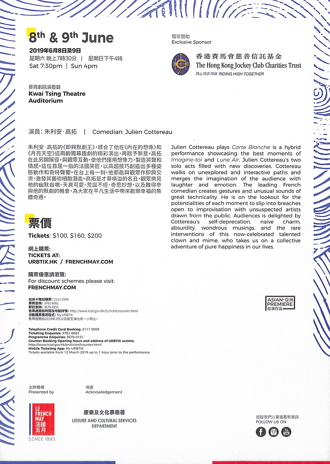 朱利安.高拓的《即興默劇王》,糅合了他在《內在的想像》和《月亮天空》這兩齣獨幕趣劇的精彩演出,再賦予新意。高拓在此另闢蹊徑,與觀眾互動,使他們運用想像力,製造笑聲和情感。這位首屈一指的法國笑匠,以高超技巧創造出多種姿態動作和奇特聲響。在台上每一刻,他都能與觀眾作即興交流,激發其藝術細胞潛能。高拓是才華橫溢的名丑,觀眾樂見他的幽默自嘲、天真可愛、荒誕不經、奇思妙想,以及難得參與他的默劇的機會,為大家在平凡生活中帶來歡樂幸福的集體奇遇。