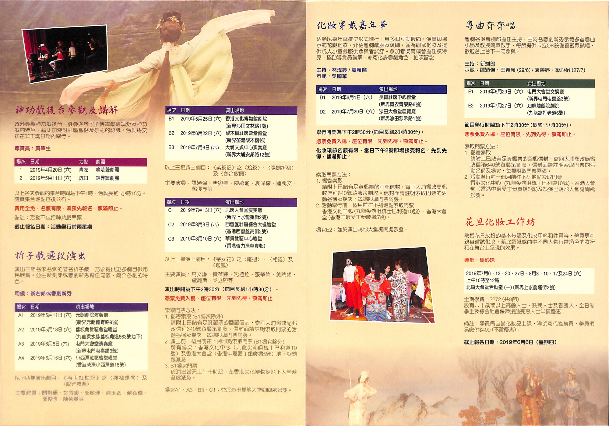 計劃藉舉辦不同類型的活動,包括粵劇程式排戲工作坊、神功戲後台參觀及講解、粵曲齊齊唱、花旦化妝工作坊、折子戲選段演出及化妝穿戴嘉年華等項目,在社區內推廣粵劇藝術,為普羅大眾提供接觸粵劇的機會,希望觀眾在觀賞之餘,亦可透過親身參與各項活動認識粵劇。神功戲後台參觀及講解透過參觀神功戲後台,讓參與者了解傳統戲班規矩及神功戲的特色,藉此加深對社區習俗及祭祀的認識。活動將安排在非正誕日期內舉行。