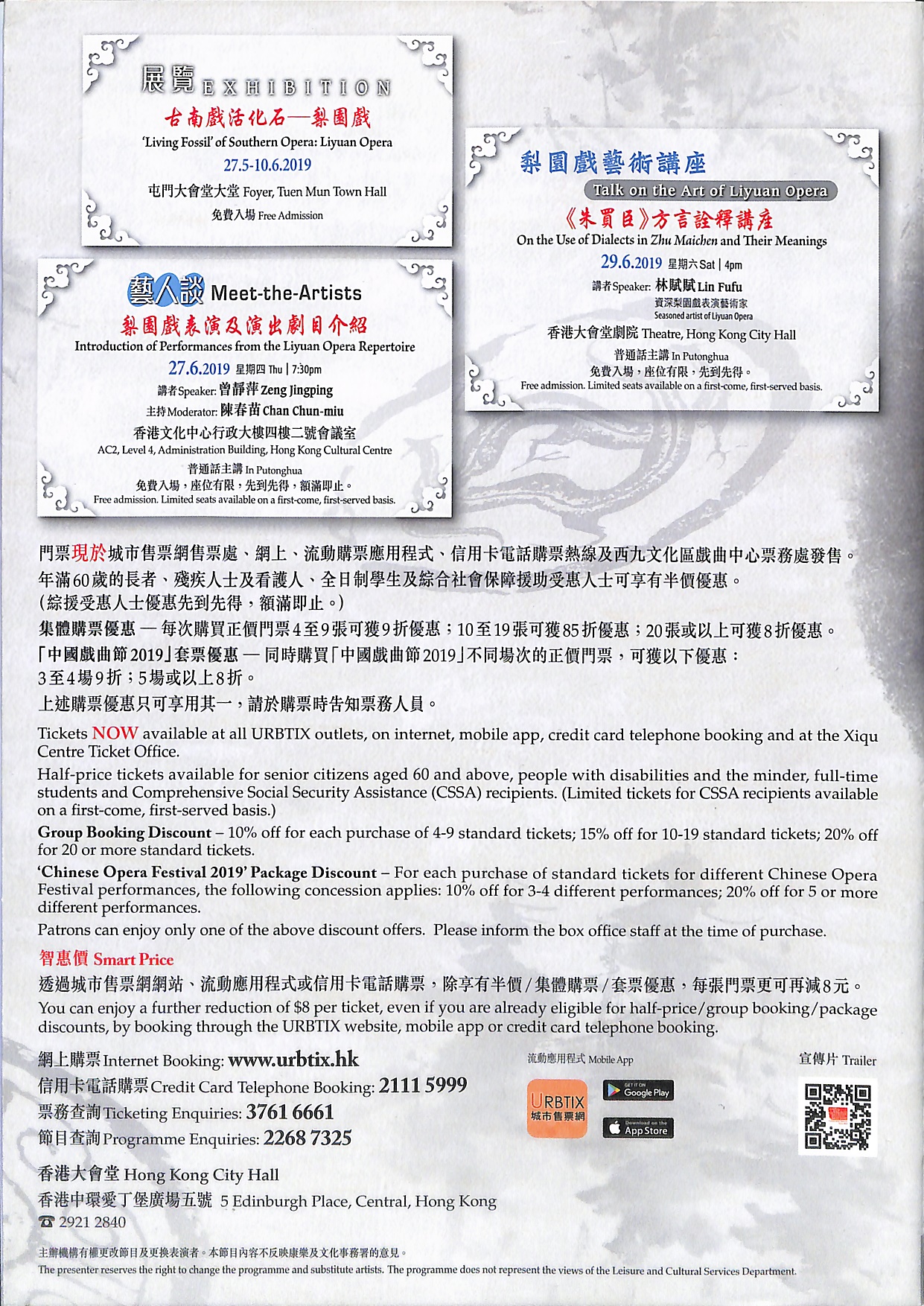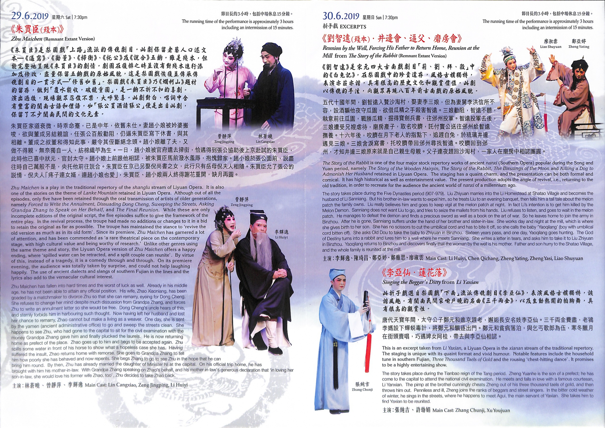 梨園戲劇目分爲「上路」、「下南」及「小梨園」三大流派。「上路」大多搬演忠孝節義的題材,保存了許多宋元時期南戲古劇目。《朱買臣》劇本經老藝人加以口述後修復而成,劇團在復排之時並未對殘本進行添加修改,盡量保留其原始風貌,同時亦可完整呈現整體劇情。此劇對白、唱詞中含有豐富的閩南古語和俚語,且又保留了許多閩南民間文化元素,故此劇被譽為具有高度文化及研究價值的珍貴劇作。「下南」大多搬演民間故事,如充滿濃郁生活色彩的《李亞仙‧蓮花落》。「小梨園」以生旦戲見長,表演細膩精緻,保留許多明初南戲劇目。《呂蒙正》屬宋元南戲劇目,為「小梨園」傳統「十八棚頭」之一。另一齣「小梨園」劇目《劉智遠》為中國四大南戲中的《白兔記》,乃梨園戲中的珍貴遺存。國家級非物質文化遺產項目梨園戲代表性傳承人及中國戲劇梅花獎二度梅得主曾靜萍,將與劇團為觀眾呈現古南戲的古樸色彩。