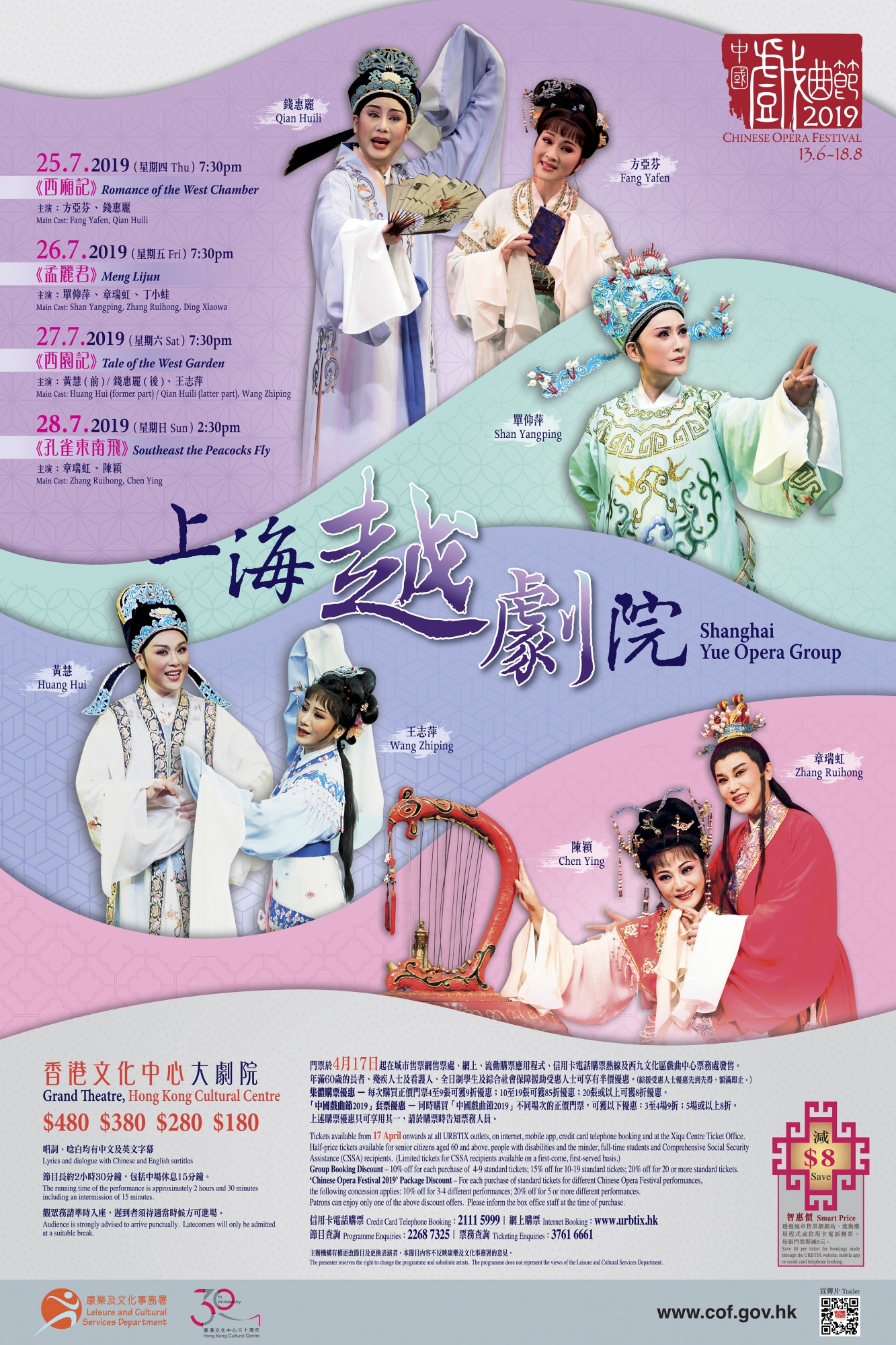 越劇曲調婉轉柔美,表演唯美典雅,流派藝術各有獨特的風格及迷人之處。今年越劇節目匯聚上海越劇院多位著名梅花獎得主兼國家一級演員,包括上海越劇院副院長徐(玉蘭)派錢惠麗、一團團長袁(雪芬)派方亞芬、范(瑞娟)派章瑞虹、王(文娟)派單仰萍及王志萍,演出傳統經典長劇《西廂記》、《孟麗君》、《西園記》及《孔雀東南飛》。文詞優雅的愛情作品《西廂記》是根據元代作家王實甫之同名雜劇改編而成,為越劇袁派經典劇目之一,其詩化的舞台呈現亦被譽為是最忠於王實甫原作的當代作品之一。大型宮闈喜劇《孟麗君》源出清代女詩人陳端生長篇彈詞《再生緣》,為越劇王派代表劇目之一。輕鬆喜劇《西園記》為越劇大師徐玉蘭、王文娟的名作,劇本根據明末劇作家吳炳所作的同名傳奇及上世紀60年代劇作家貝庚改編的崑劇版改寫,節奏明快,不論劇情或演出設計,實為一細膩精巧的作品。《孔雀東南飛》取材於東漢樂府詩《古詩為焦仲卿妻作》,為越劇范派及傅(全香)派的優秀傳統保留劇目,其中〈人去樓空空寂寂〉及〈惜別離〉等多段經典唱段至今仍廣為流傳。多位當紅越劇著名演員聚首一堂演繹首本劇目,難得一會,豈可錯過!