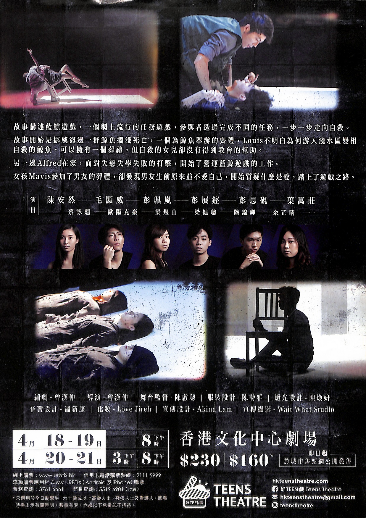源自俄羅斯社交網站的「藍鯨遊戲」,如海嘯般蔓延開來。五十條指示,一步步帶玩家步向死亡。當習慣了恐懼,那個被珍如生命的網絡世界,鍵盤聲也就戛然而止。抵抗不了寂寞的引力,我們一起擱淺在月光下。手臂上刀劃的鯨魚紋身,不斷在打嗝、噴氣。我們眼睛相對視,首次也是最後一次。鯨魚的眼睛沒有淚腺,所以我們只好笑。最後下顎微微鬆開,直至那副讓人誤以為永遠帶着微笑的表情消失為止。