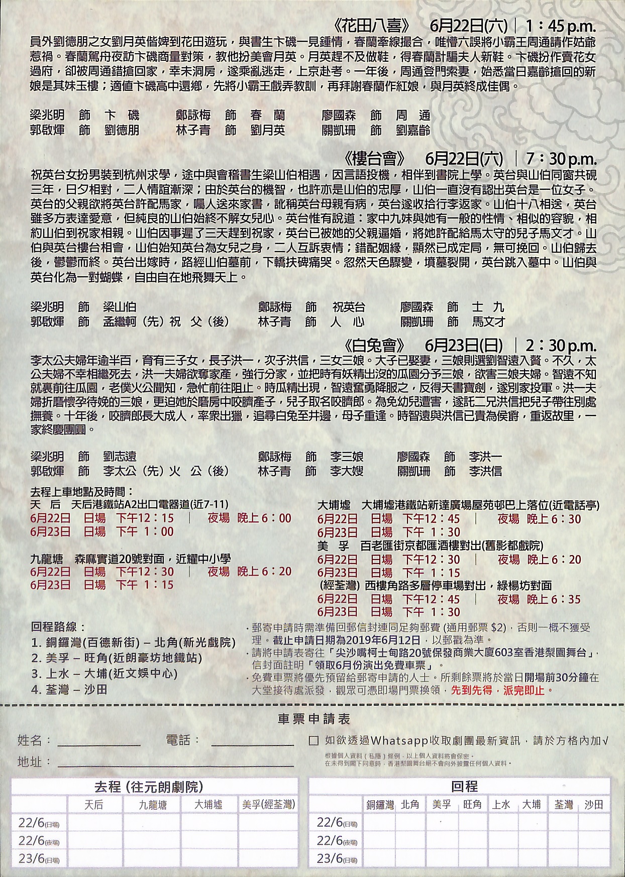 祝英台女扮男裝到杭州求學,巧遇梁山伯,因言語投機,相伴到書院上學。二人同窗共硯三年,山伯也不疑她女兒身。英台在家書催促下返家,山伯十八相送,英台雖多方表達愛意,無奈山伯始終不解女兒心。英台惟有說道:家中九妹與她有一般的性情、相似的容貌,相約山伯到祝家相親。山伯因事遲了三天趕到祝家,英台已被她的父親逼婚,將她許配給馬太守的兒子馬文才。山伯與英台樓台相會,山伯始知英台為女兒之身,二人互訴衷情。山伯悲槍欲絕,返家奄奄病終。英台出嫁時,路經山伯墓前,下轎扶碑痛哭。忽然天色驟變,墳墓裂開,英台跳入墓中。山伯與英台化為一對蝴蝶,自由自在地飛舞天上。