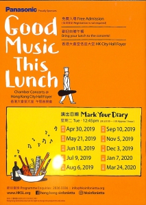 香港小交響樂團於香港大會堂定期舉行的午間音樂會,以音樂洗滌心靈,讓大家在忙碌的一天中,趁著午餐時間輕鬆一下,一邊享用午餐,一邊欣賞美妙的室樂演奏。霍斯里夫 雙簧管、中提琴及敲擊樂三重奏(1978,1981修訂)倫特根 A小調第二鋼琴五重奏,作品100布拉姆斯 C大調第二鋼琴三重奏,作品87