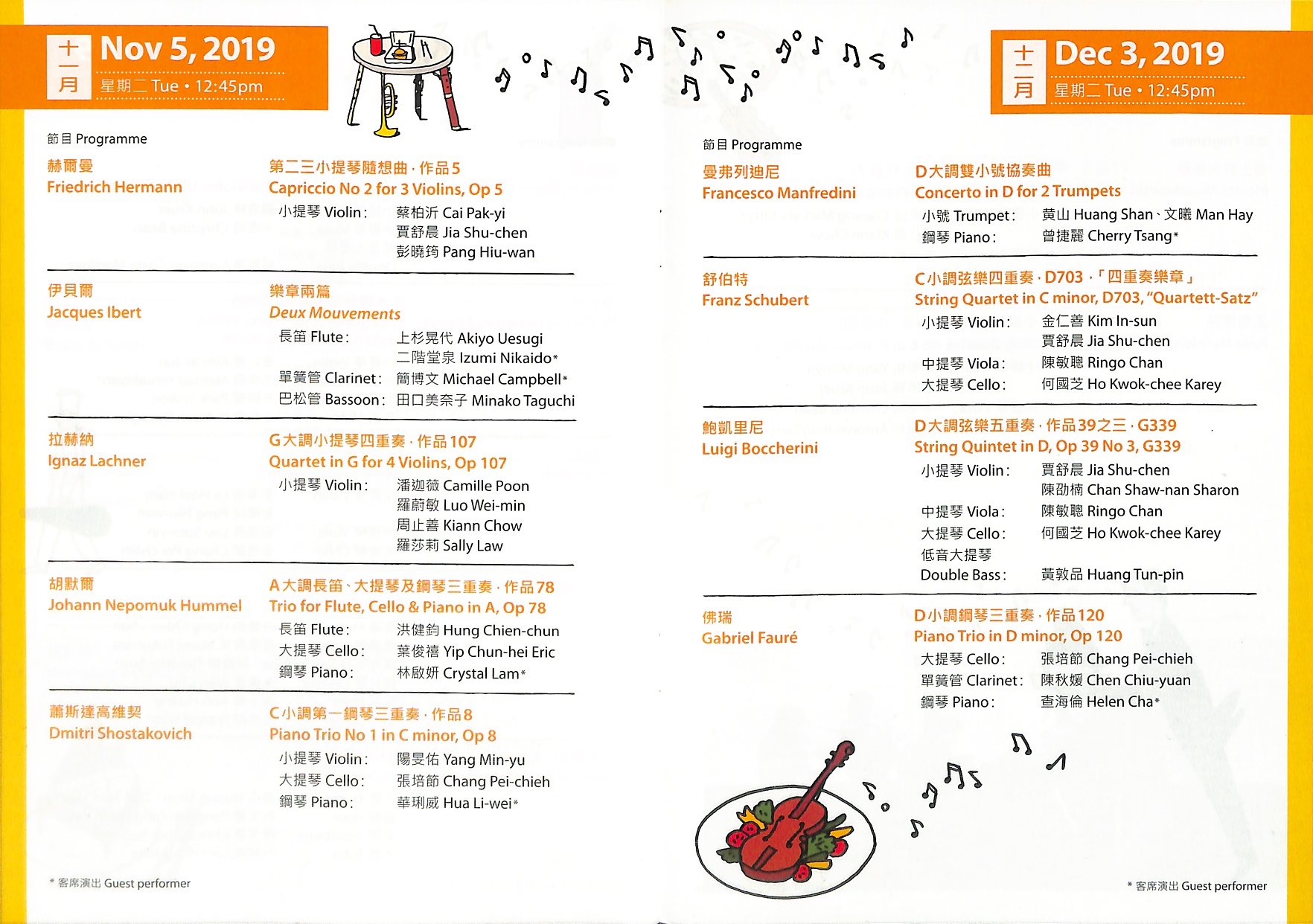 香港小交響樂團於香港大會堂定期舉行的午間音樂會,以音樂洗滌心靈,讓大家在忙碌的一天中,趁著午餐時間輕鬆一下,一邊享用午餐,一邊欣賞美妙的室樂演奏。曼弗列迪尼 D大調雙小號協奏曲舒伯特 C小調弦樂四重奏,D703,「四重奏樂章」鮑凱里尼 D大調弦樂五重奏,作品39之三,G339佛瑞 D小調鋼琴三重奏,作品120