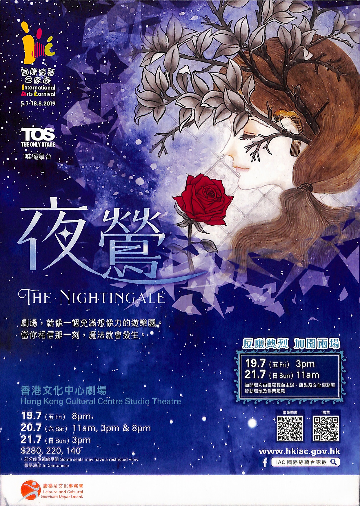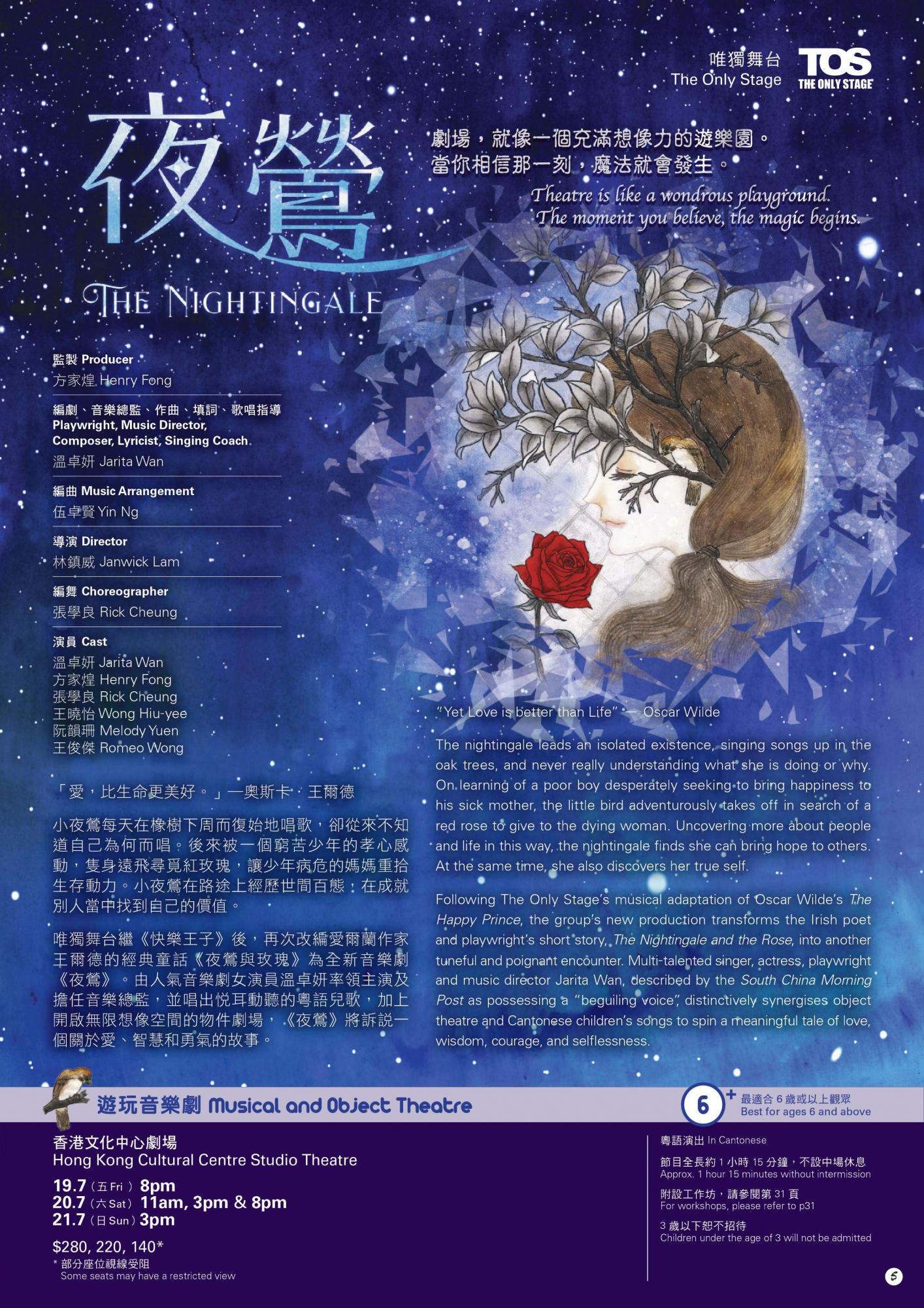 唯獨舞台繼《快樂王子》後,再次改編愛爾蘭作家王爾德的經典童話《夜鶯與玫瑰》為全新音樂劇《夜鶯》。由人氣音樂劇女演員溫卓妍率領主演及擔任音樂總監,並唱出悅耳動聽的粵語兒歌,加上開啟無限想像空間的物件劇場,《夜鶯》將訴說一個關於愛、智慧和勇氣的故事。