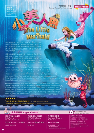 荷蘭大地劇團於2016年來港上演《小波唱遊農莊》贏盡口碑,門票火速售罄,徇眾要求加場!今次再度訪港,帶來改編自安徒生經典童話《美人魚》的戲偶音樂劇。佈景如幻似真,戲偶趣緻逗人,與公主王子齊齊演繹百聽不厭的原創歌曲,交織出一場動人心弦的海底音樂劇!